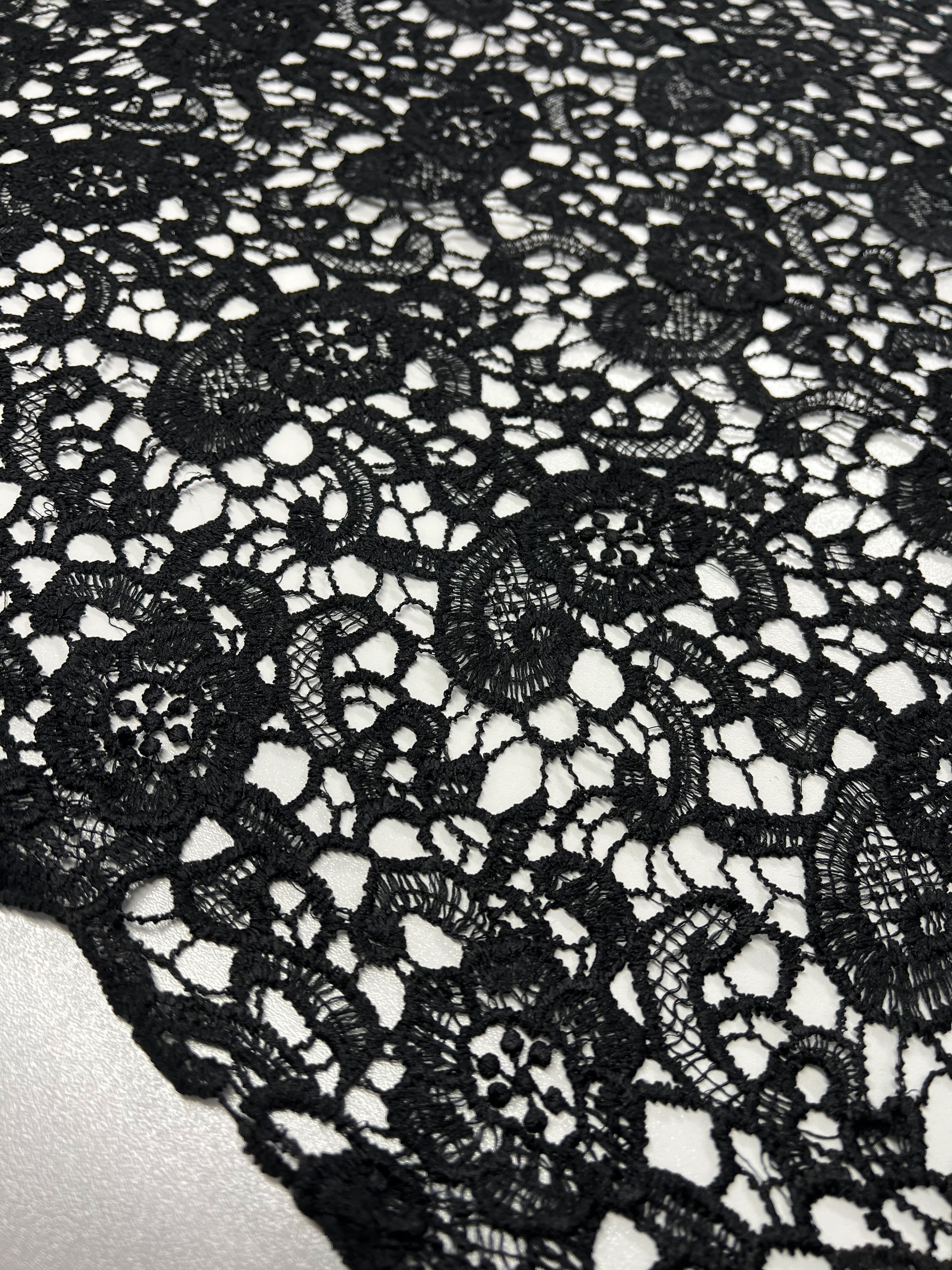 Close-up of elegant Anglaise Lace - Black Garden - 115cm from Super Cheap Fabrics with intricate floral patterns and web-like details, draped over a white background. The lace features various sizes of flowers and circular designs, showcasing versatile needlework.