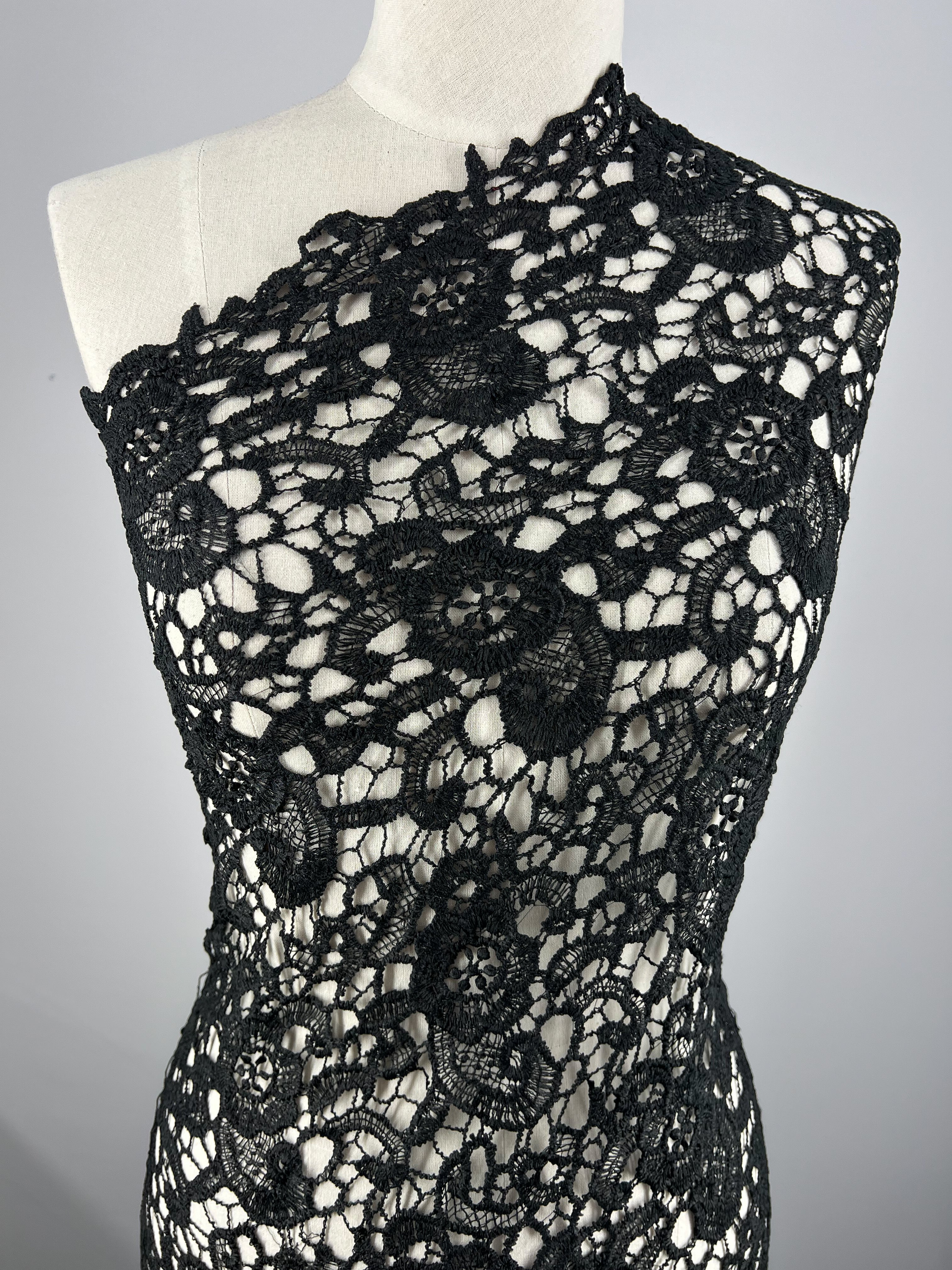 A mannequin displays a versatile one-shoulder garment made of intricate Anglaise Lace - Black Garden - 115cm from Super Cheap Fabrics with floral patterns. The design features semi-sheer areas with detailed, intertwining motifs, creating an elegant and sophisticated look against a light background.