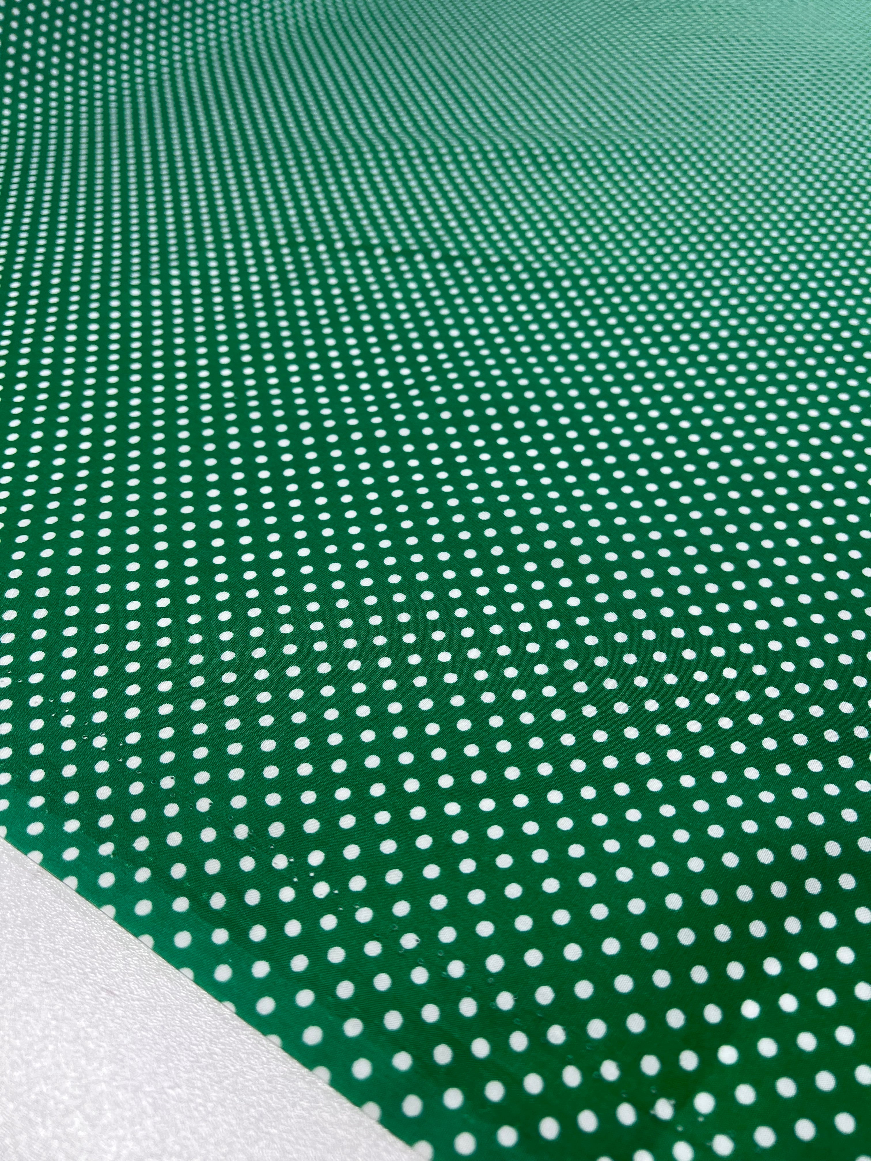 A close-up of Super Cheap Fabrics' Cotton Dots Mini in Emerald, a lightweight cotton with small white dots forming a grid, shows a perspective shift from foreground to background.