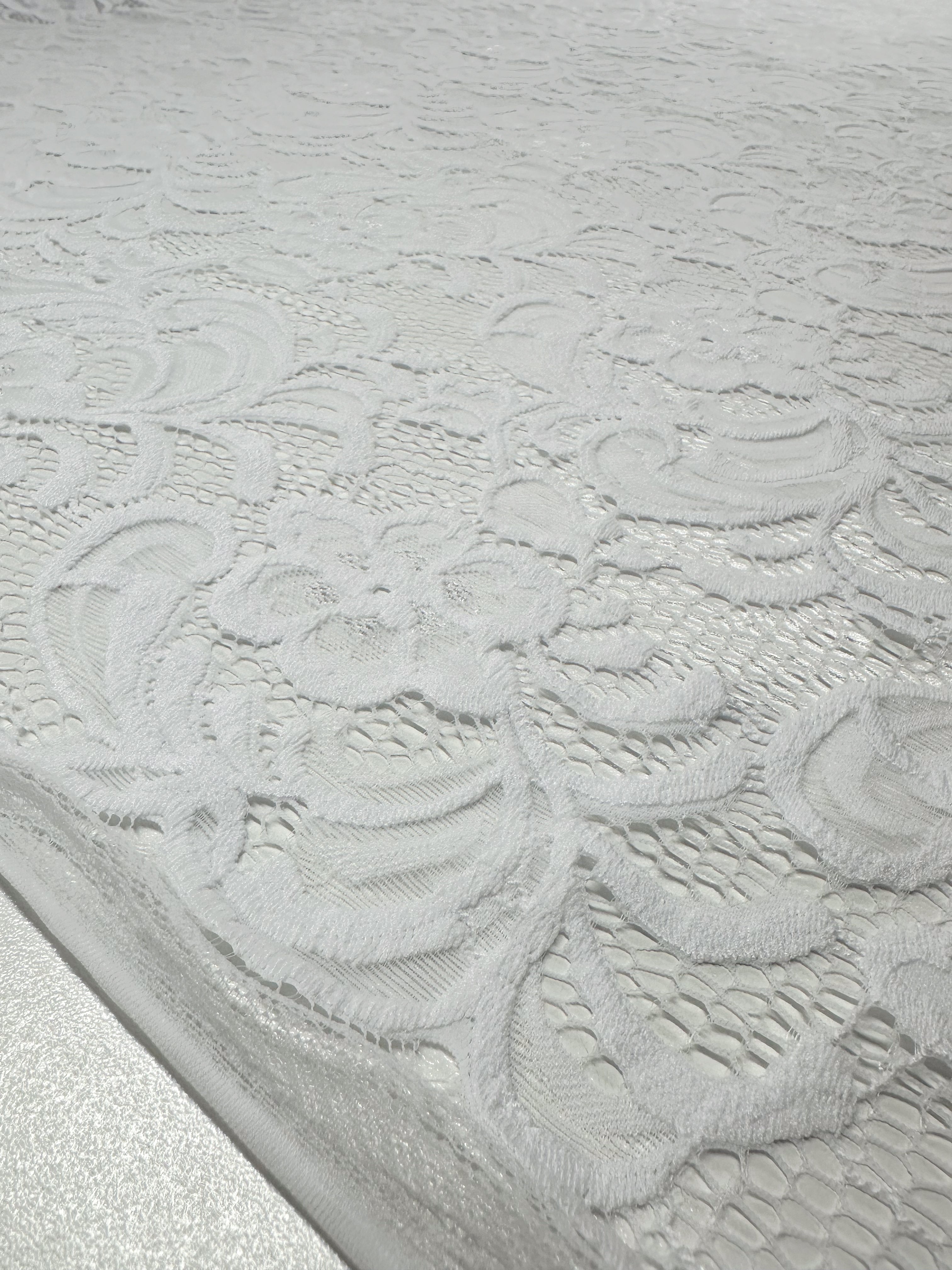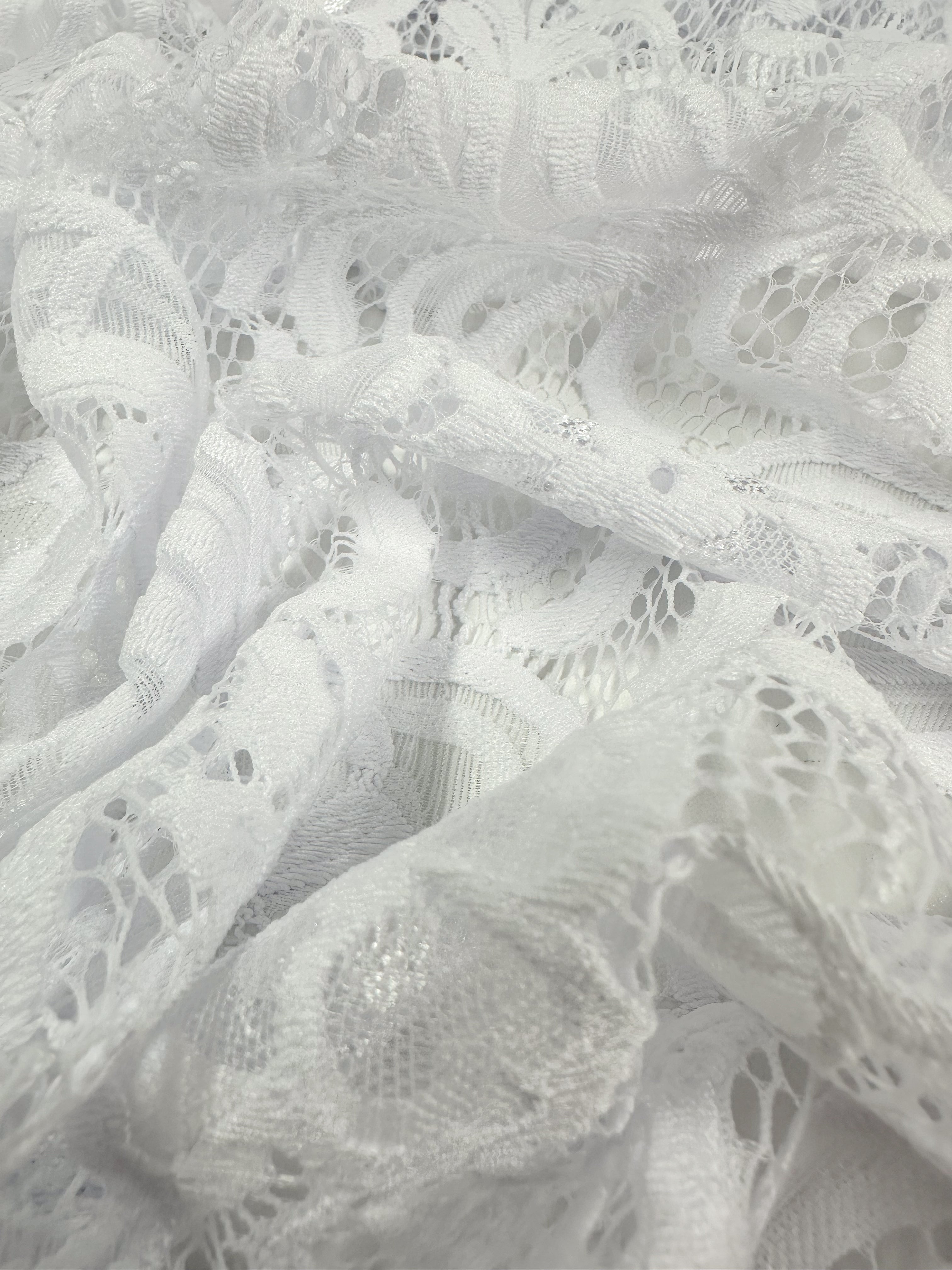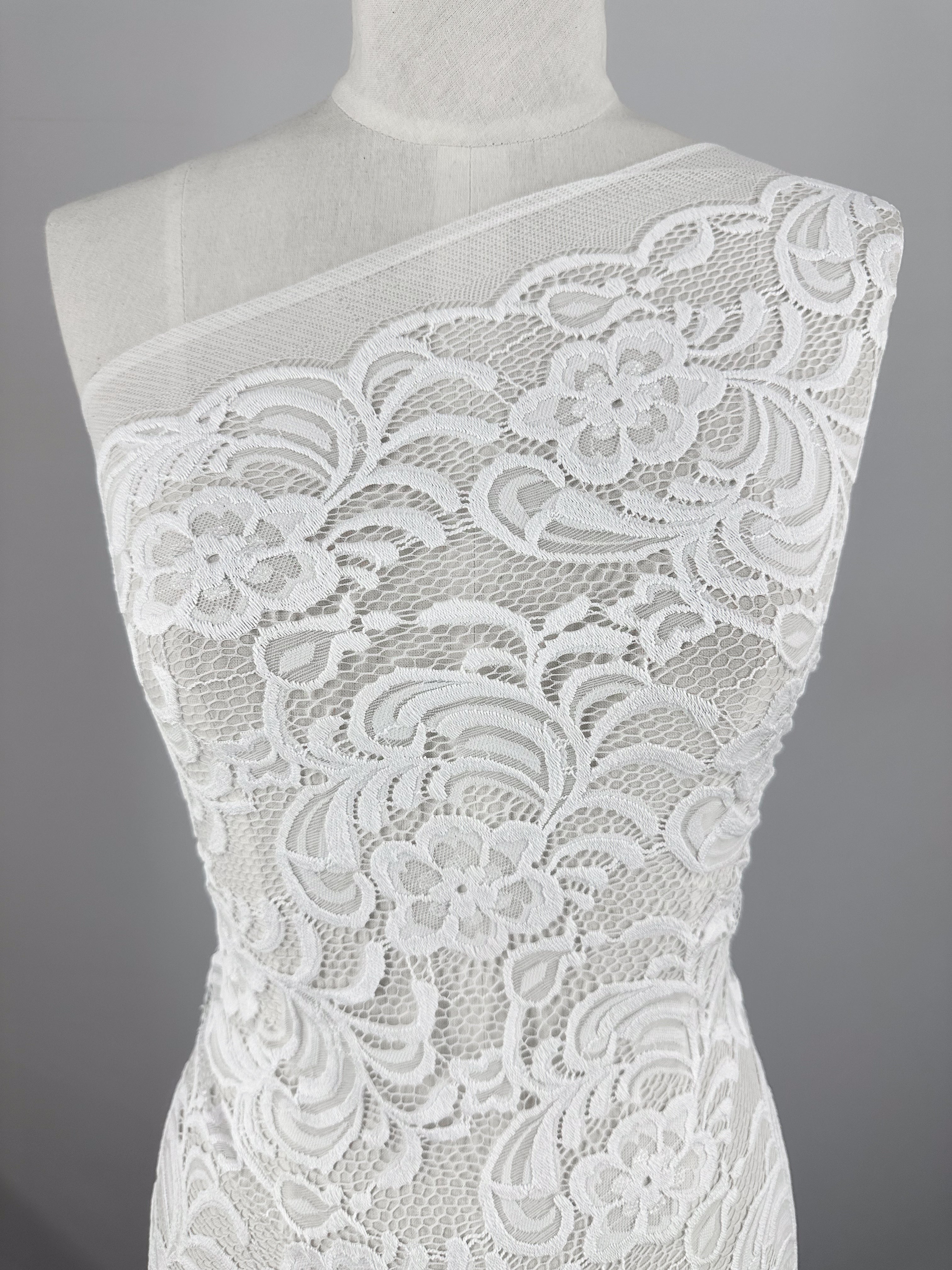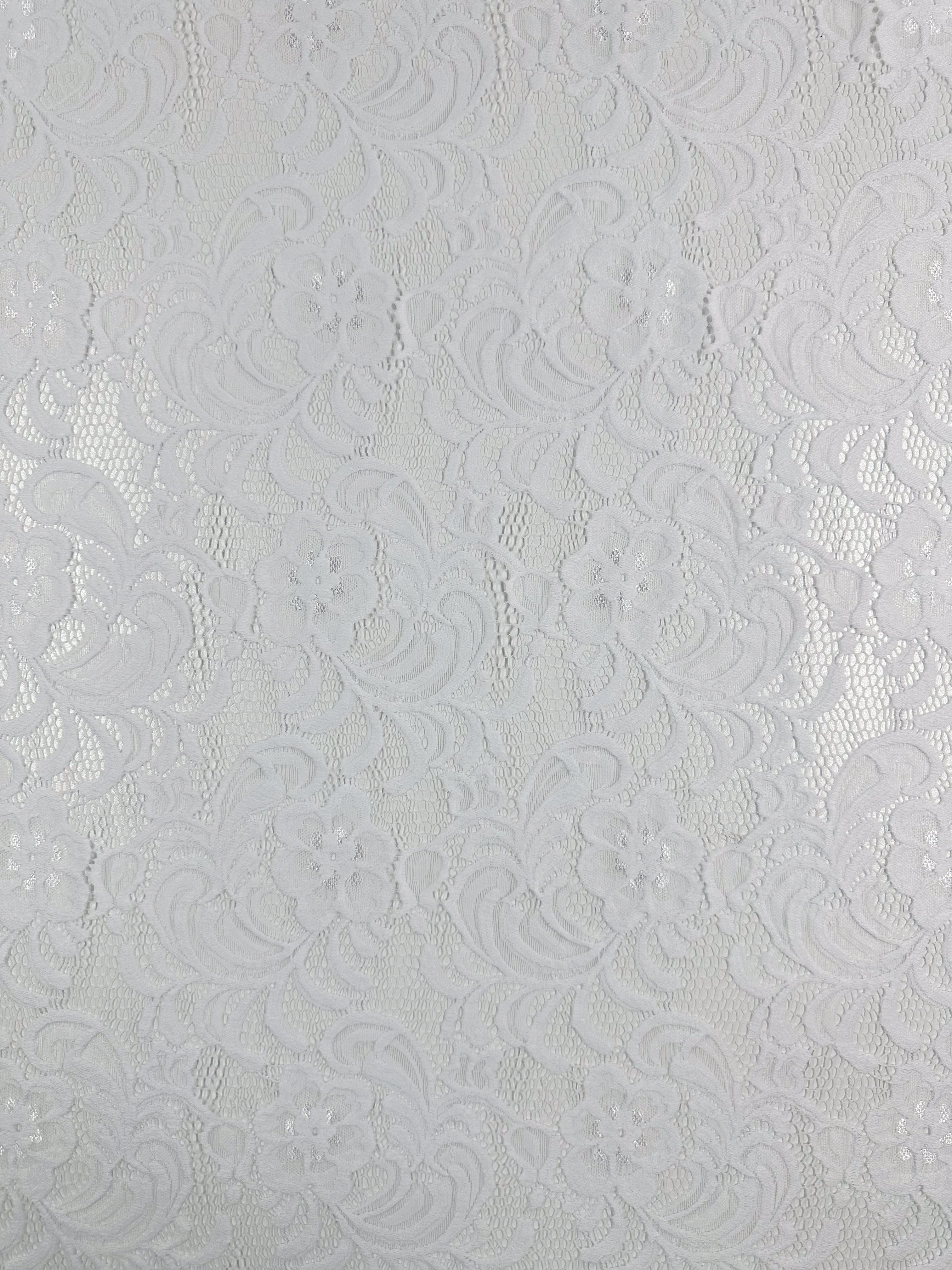A delicate lace in White, stretchy and boasts a beautiful drape.