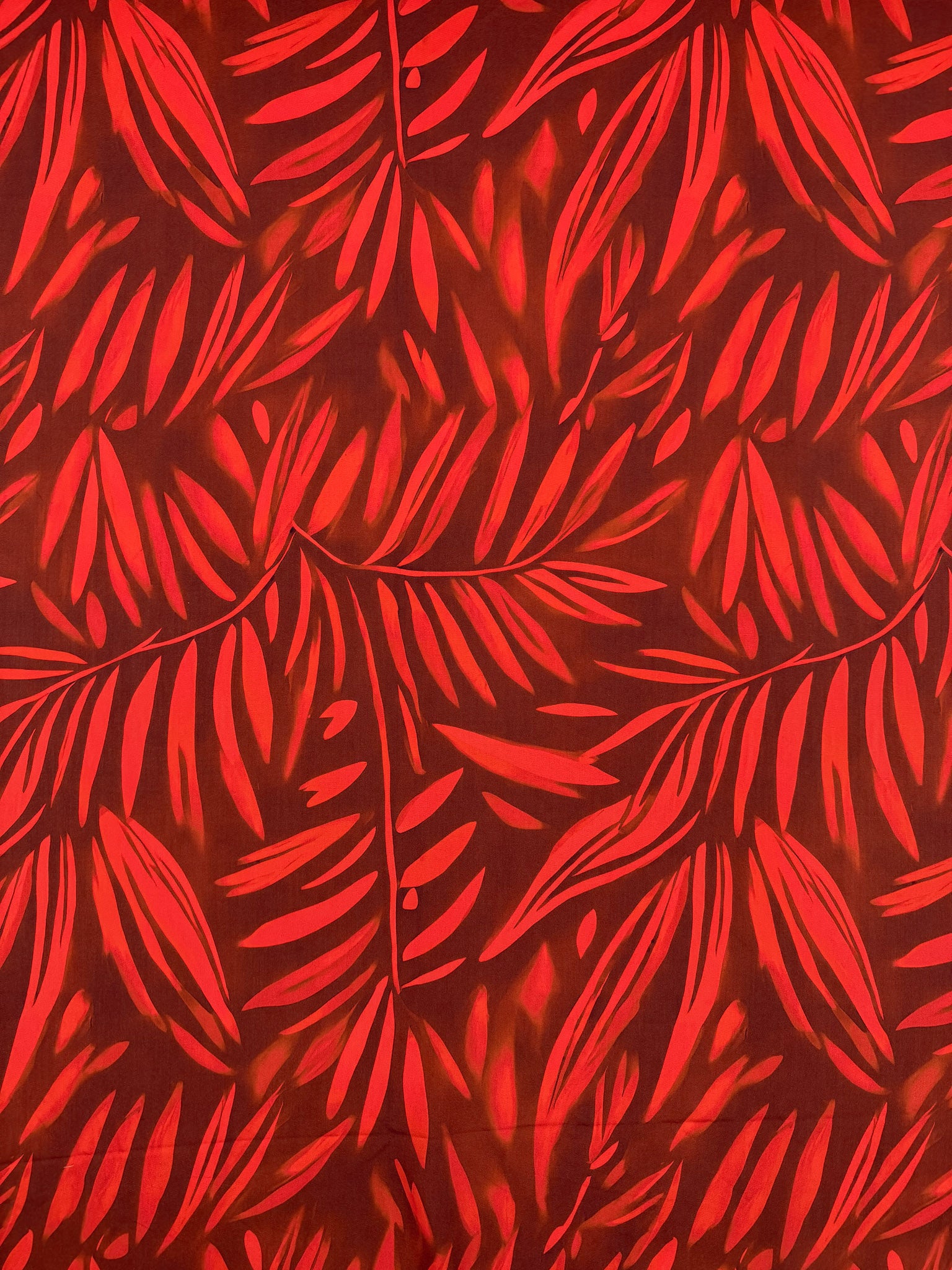 Our Designer Rayon showcases a beautiful and colourful fabric with vibrant prints that can be used for various purposes such as dresses, skirts, blouses, curtains, and more. Our collection showcases a soft, lightweight fabric with a smooth drape and a luxurious feel. Overall, rayon fabric offers both comfort and style, making it a versatile choice for any project. Crimson Palm showcases a bold tropical leaf design in radiant shades of crimson and red, contrasted beautifully against a deep brown base.