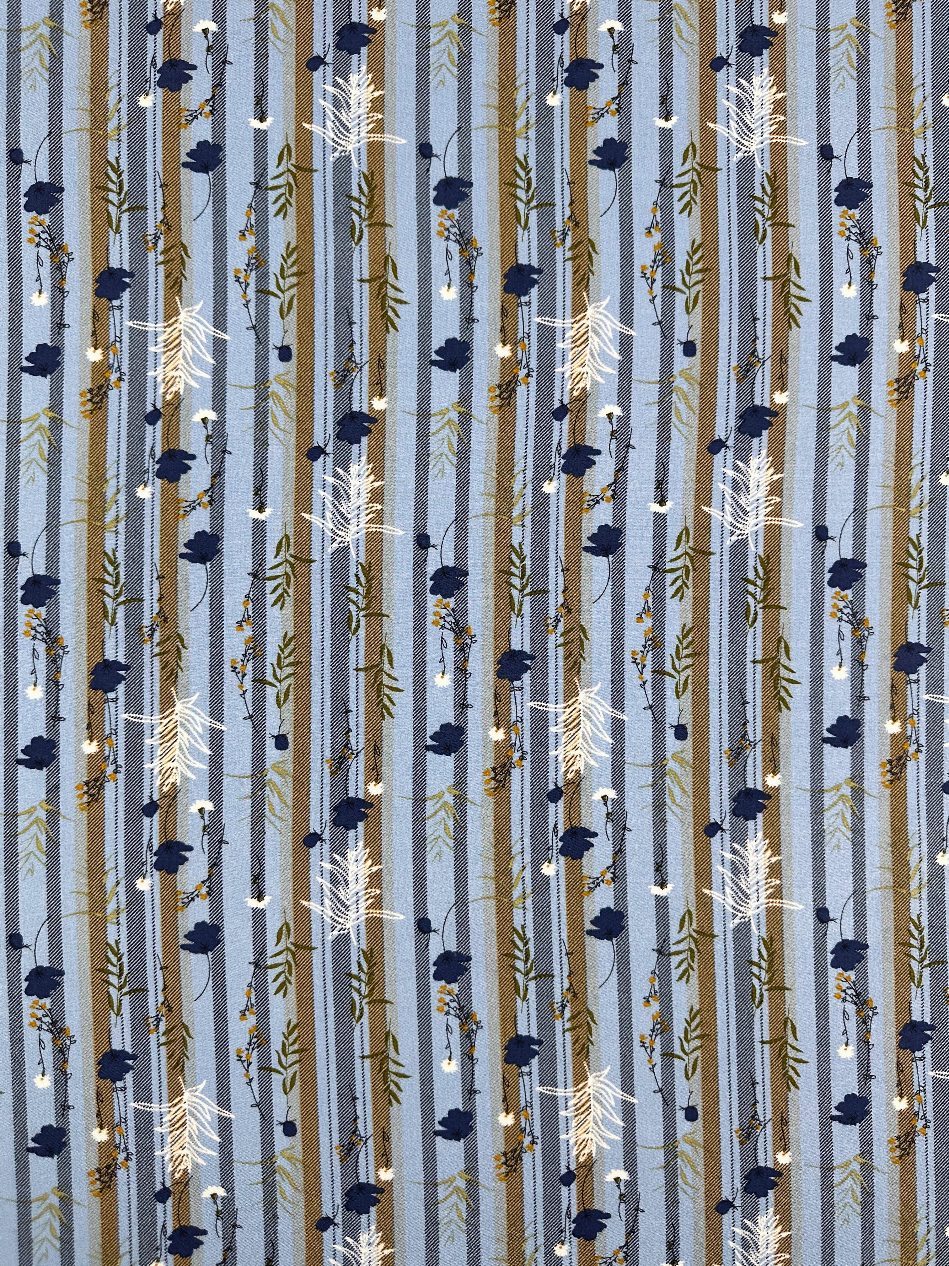 Fieldstripe Bloom - Faint florals scattered between soft vertical lines in dusky blues and olives.