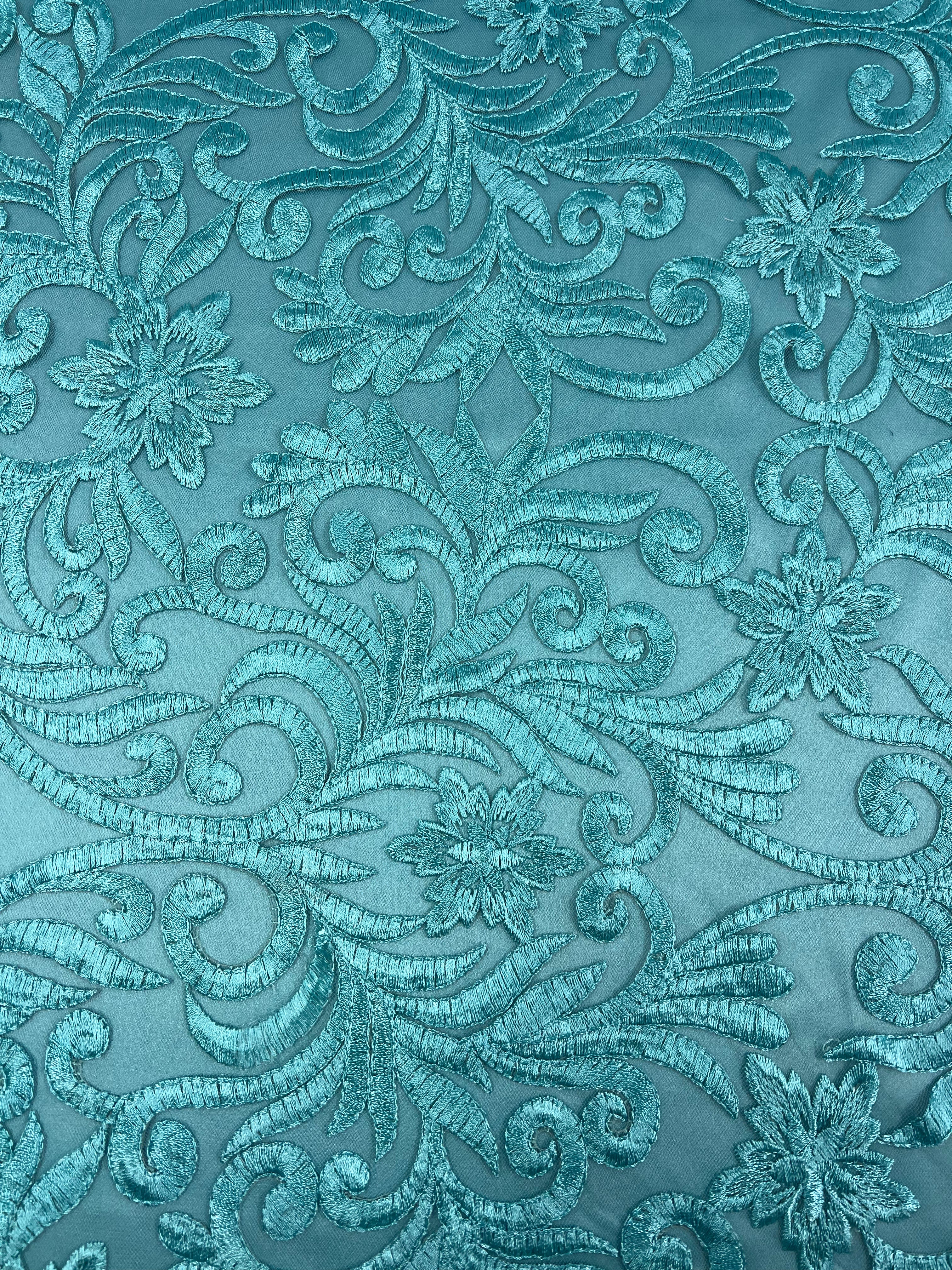 Our beautiful and elegant lace in Galadriel is a gorgeous fabric of a fine netting backing with an intricate applique of flower design in peach colour. This evening lace is perfect for dresses, tops, jackets and skirts!