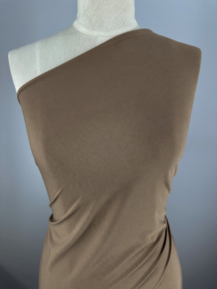 Interlock twist yarn fabric. This opaque fabric has been knit to have great elasticity and a soft touch. This medium weight fabric is the perfect weight for tops, dresses skirts and loose pants.