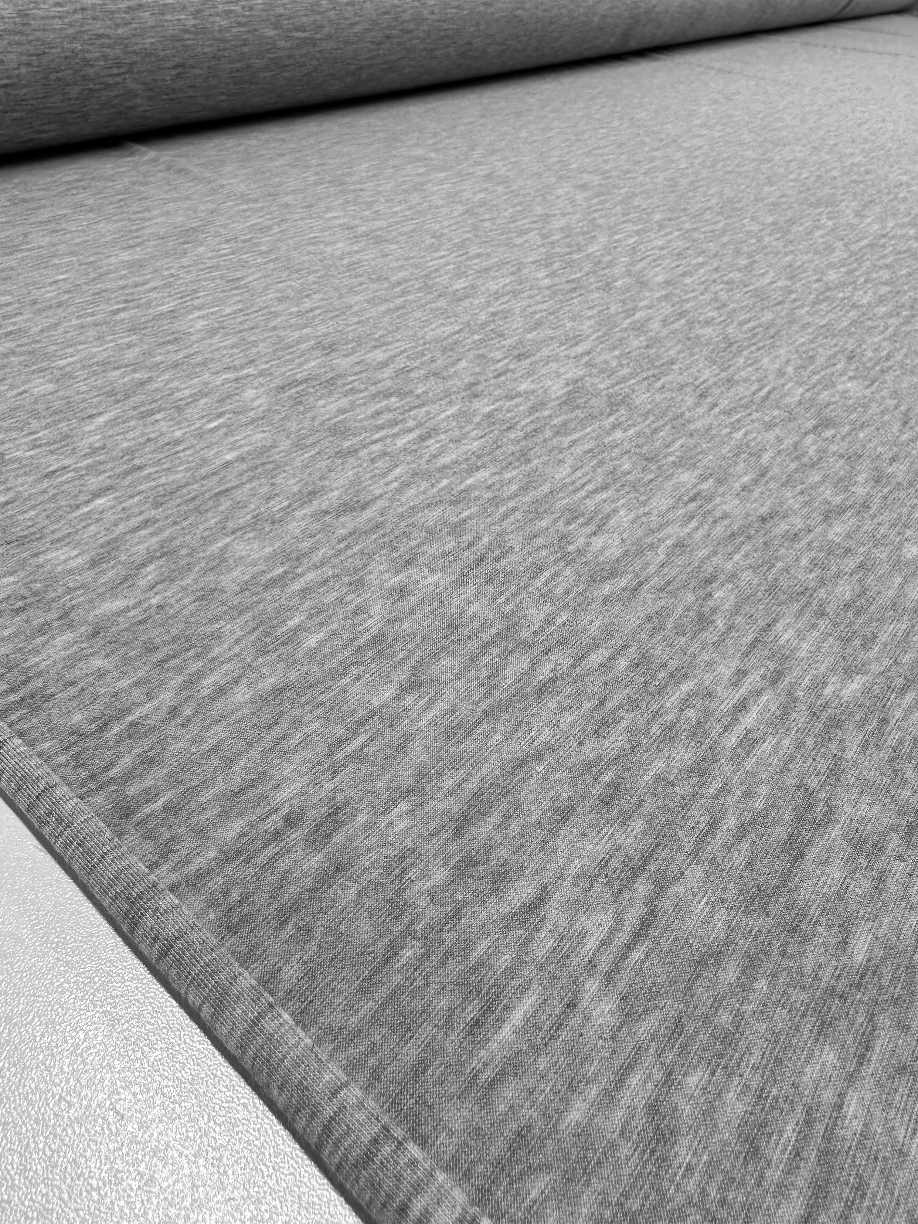 A close-up view of a large roll of lightweight jersey fabric. The Jersey - Grey - 170cm from Super Cheap Fabrics has a subtle textured pattern, with slight variations in shading and weave. The roll is partially unrolled, revealing a smooth surface. The overall appearance is clean and uniform.
