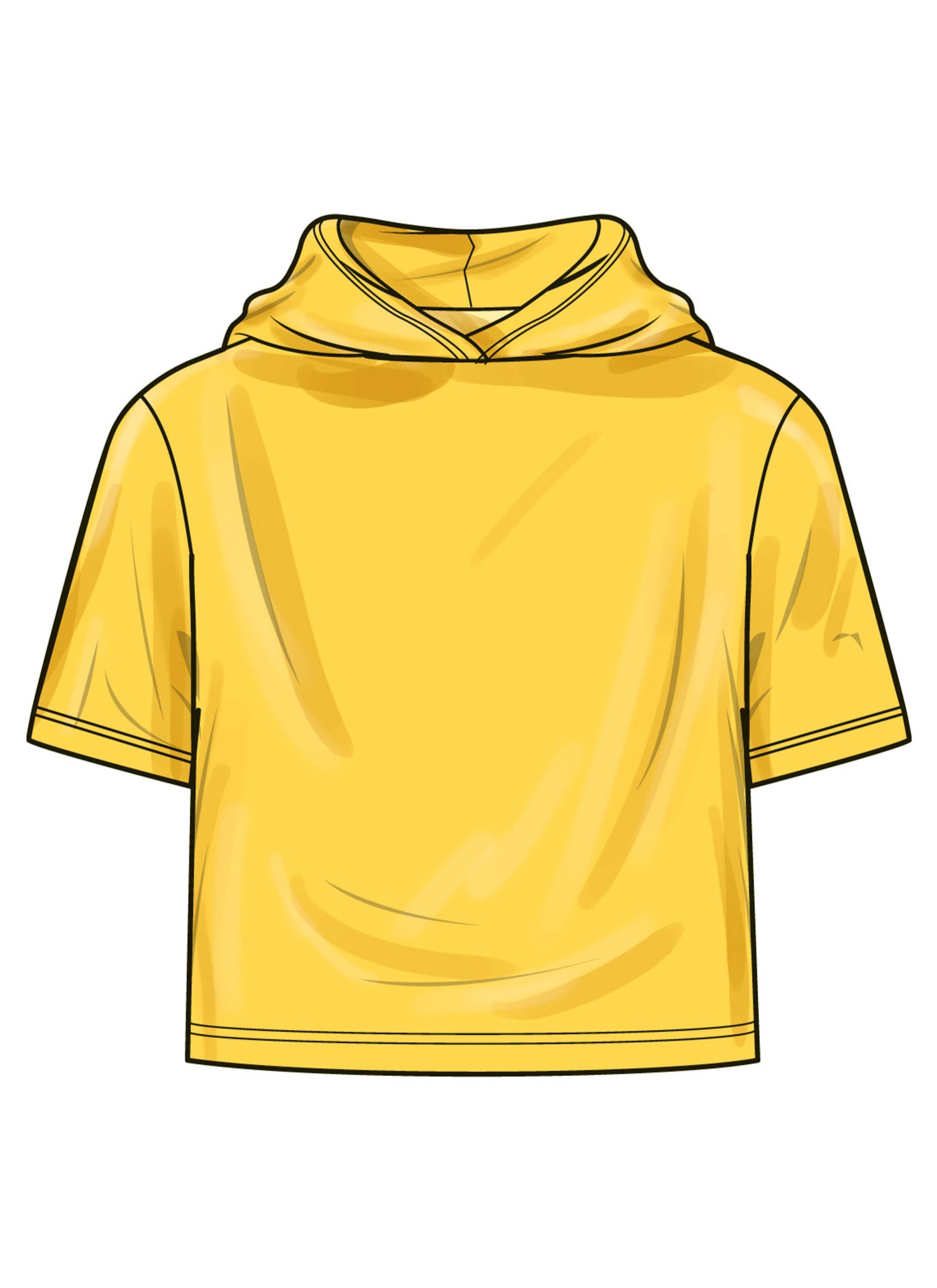 This short sleeve hooded t-shirt is designed with comfort and durability in mind, featuring double-needle topstitching along the sleeves and hem for a clean, finished look that holds up to wear. Paired with stylish and functional jeans, this set includes front and back seam detailing for added structure and interest. The jeans also feature a comfortable elastic waistband, functional belt loops, and practical pockets for everyday use. View C includes a contrast fabric option, adding an extra element of style and versatility to the overall design. Perfect for casual, active, or playful looks!