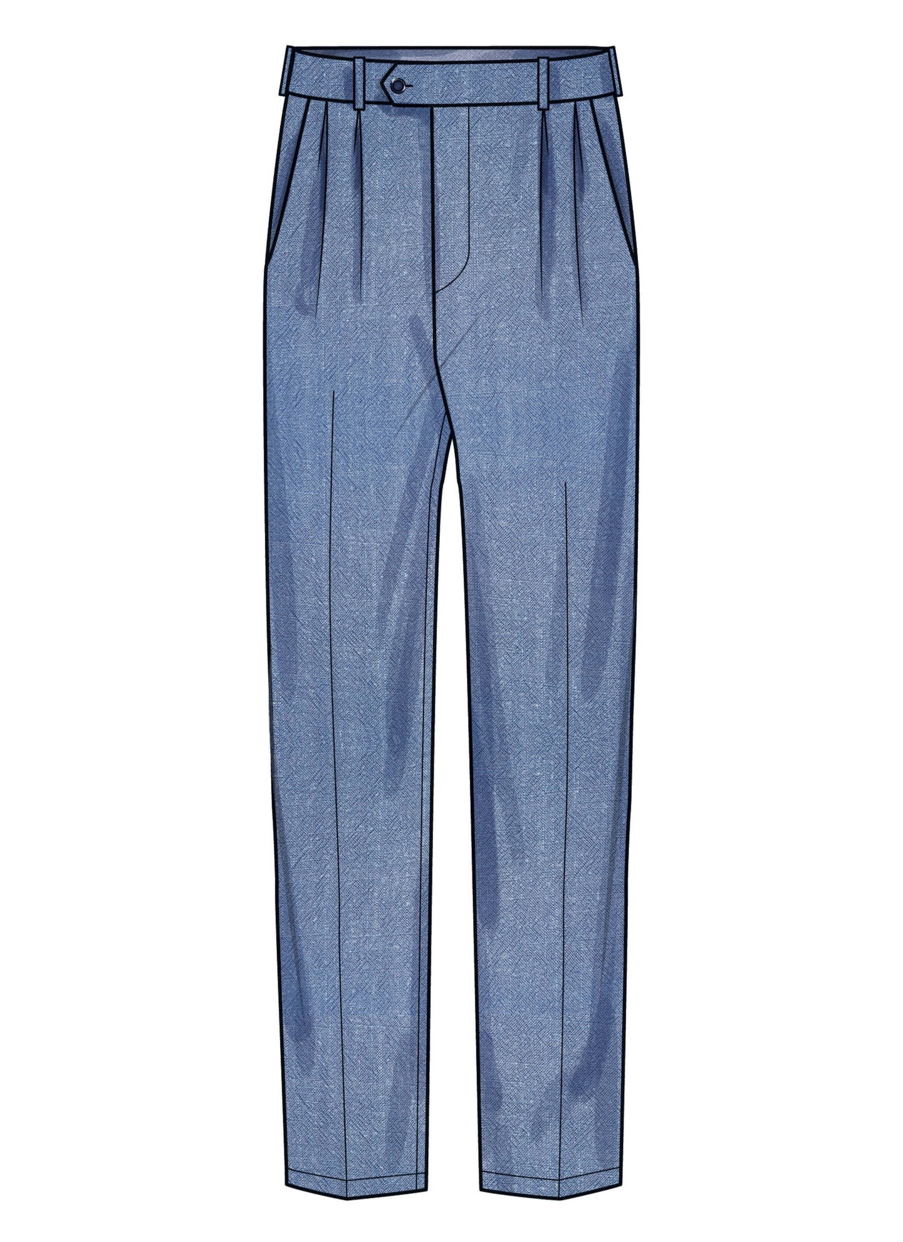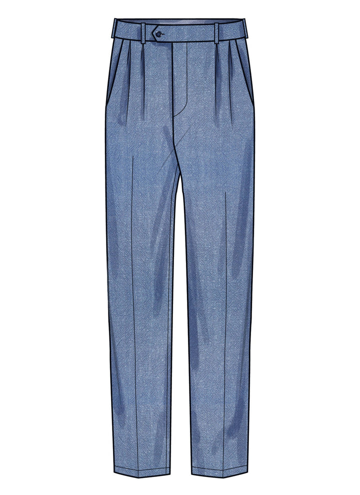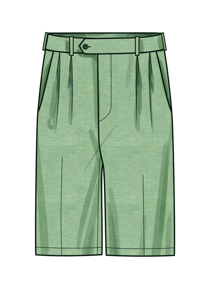 The coordinating shorts and trousers are tailored yet practical, featuring front pleats and back darts to enhance fit and shape. The waistband includes belt loops and a neat tab closure for a refined finish. Side pockets provide function, while a faux back welt pocket on the right side adds a tailored touch without the bulk. These garments combine classic design elements with everyday wearability, making them a great addition to any handmade wardrobe.