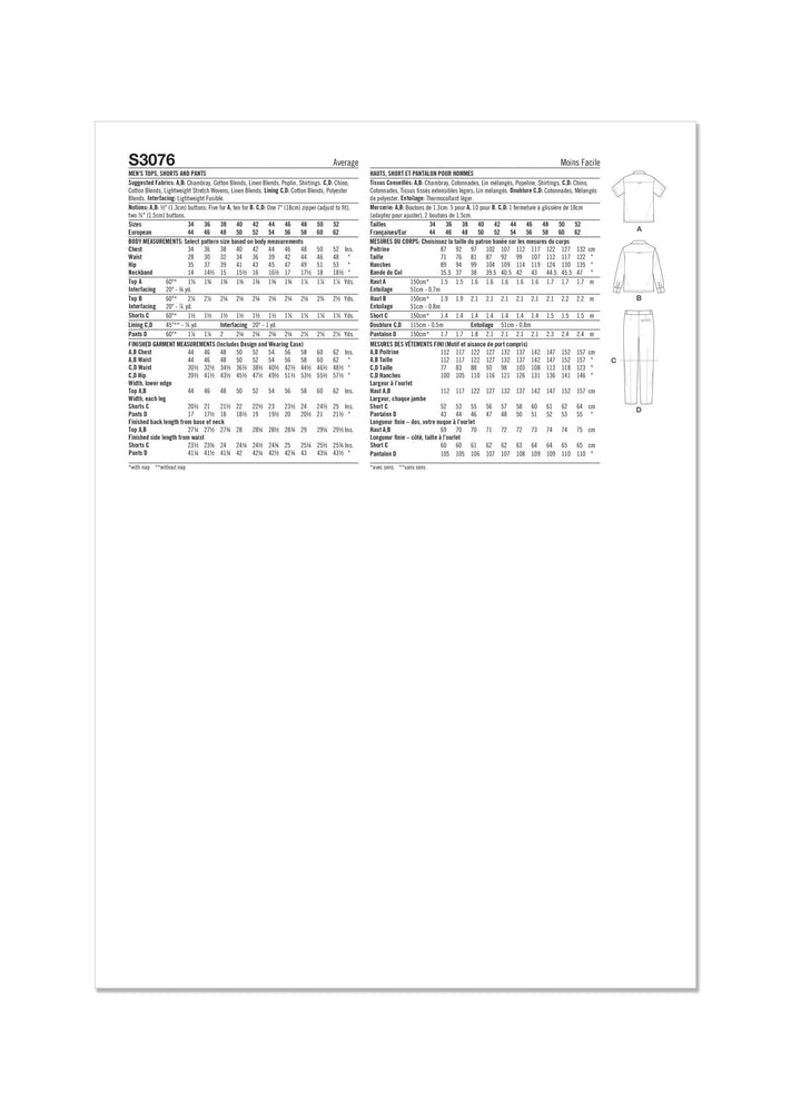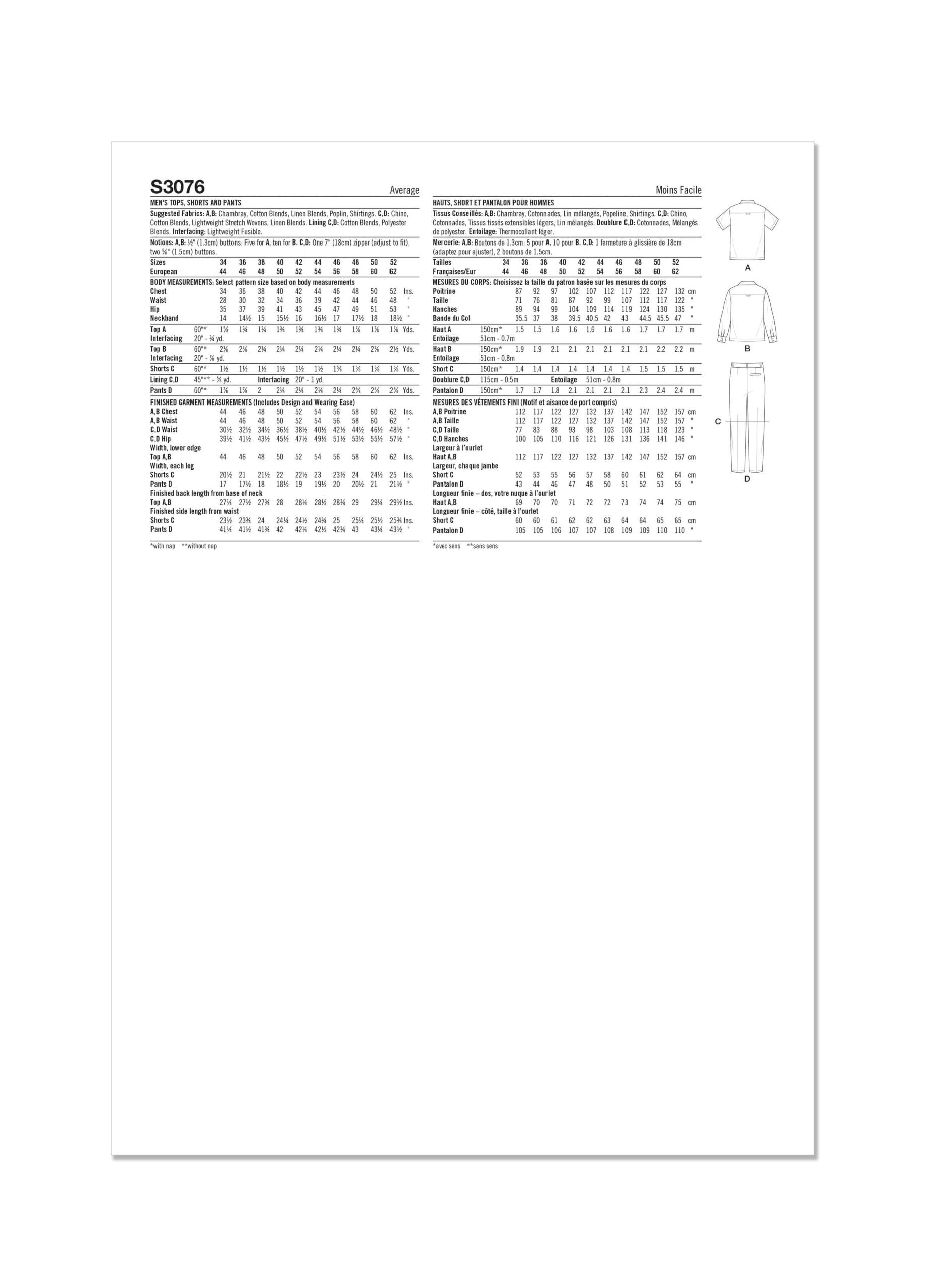A,B: Chambray, Cotton Blends, Linen Blends, Poplin, Shirtings. C,D: Chino, Cotton Blends, Lightweight Stretch Wovens, Linen Blends. Lining C,D: Cotton Blends, Polyester Blends. Interfacing: Lightweight Fusible.