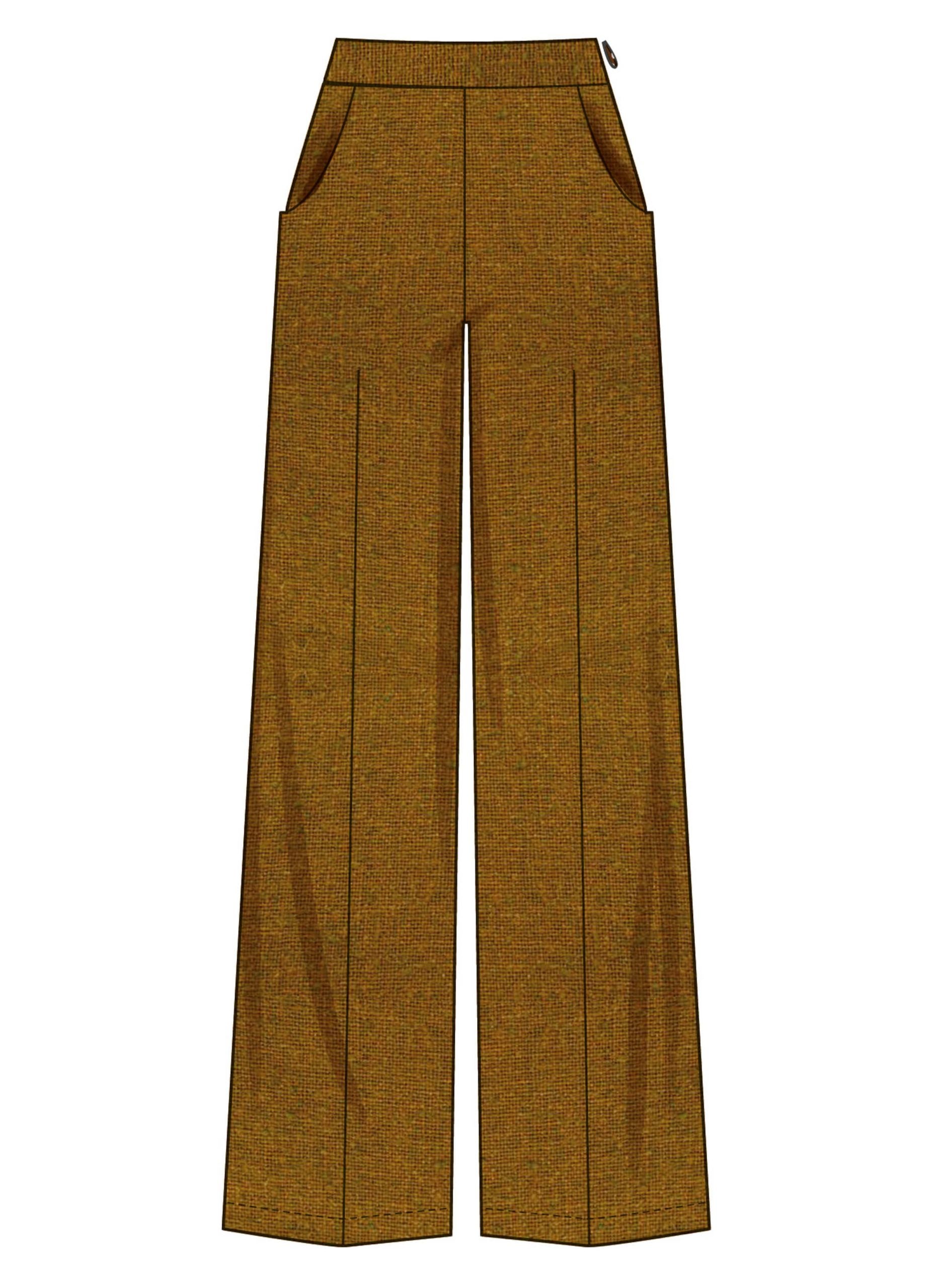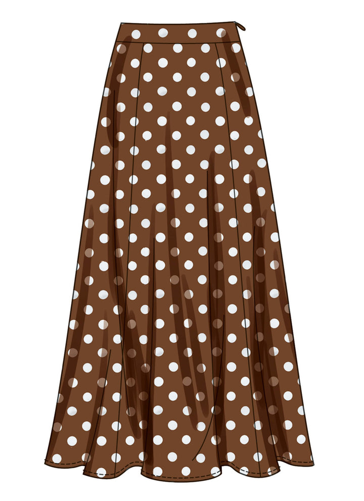 A semi-fitted, unlined vest features princess seams, front button closure, and decorative flaps. The flared, gored skirt includes a stitched hem. Views B and C showcase a contoured waistband, invisible side zipper, and finished hems. The wide-leg trousers are fitted through the hips and designed with side-front pockets.