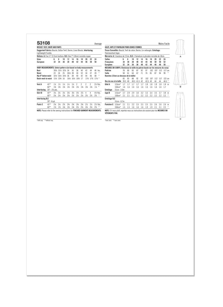 Pattern - Simplicity - S3108 - Misses’ Vest, Skirt and Trousers by American Sewing Guild