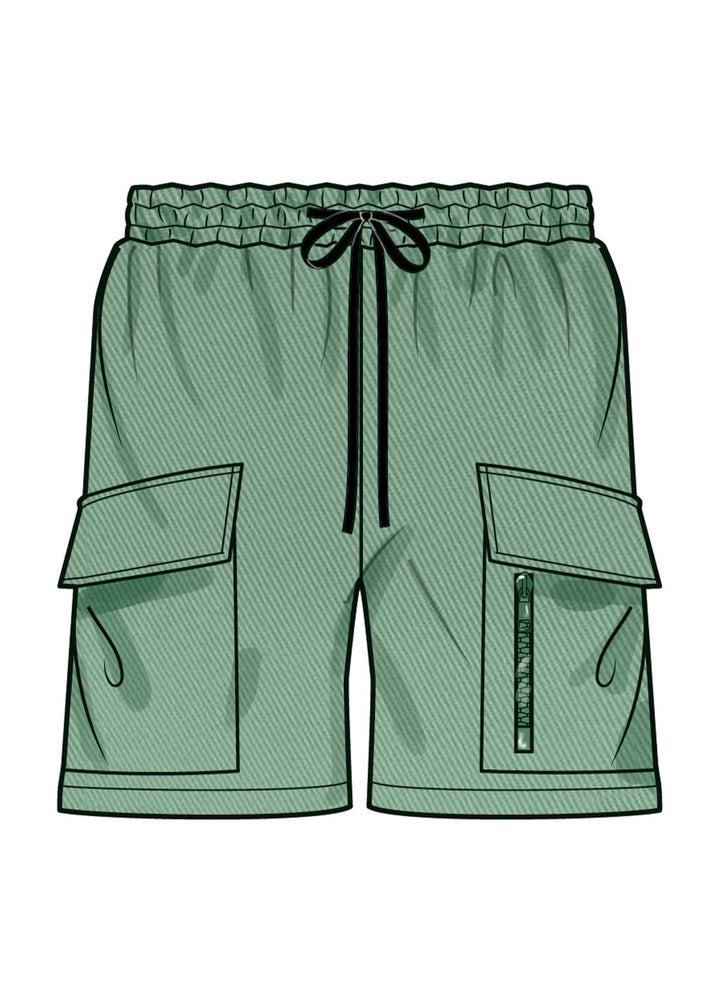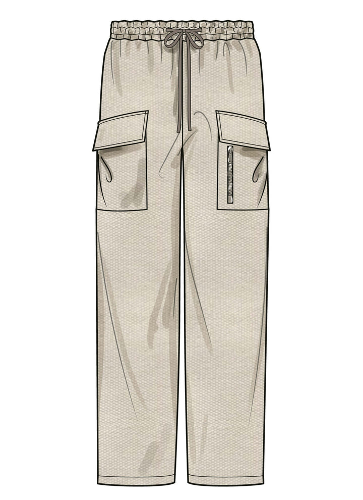 Relaxed fit shirts with pointed collar have zip front opening, flap patch pockets with zipper detail, dropped shoulders, back yoke and sleeve variations. Pull-on shorts and trousers have elastic waistband, front ties and front and back pockets.