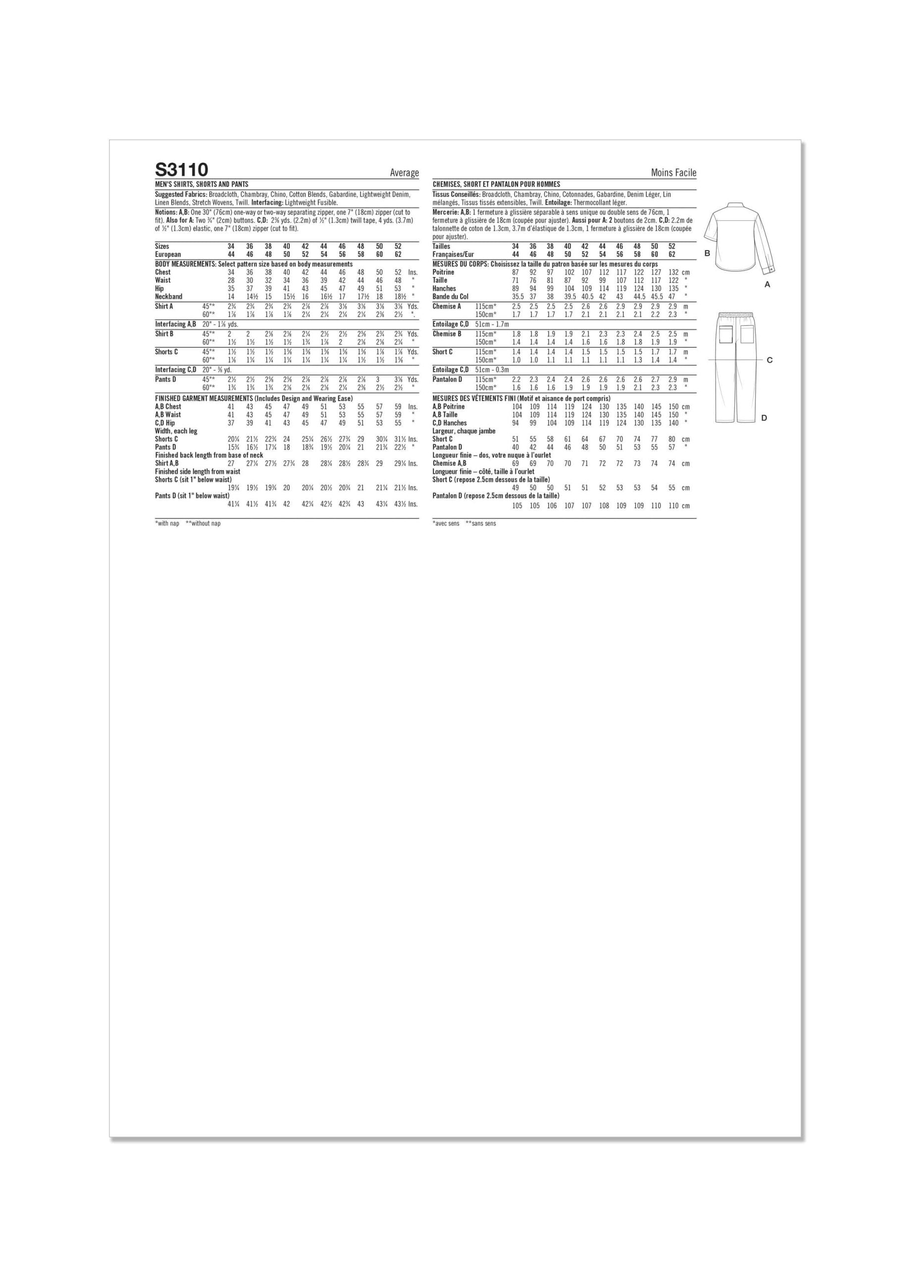 Pattern - Simplicity - S3110 - Men’s Shirts, Shorts and Trousers