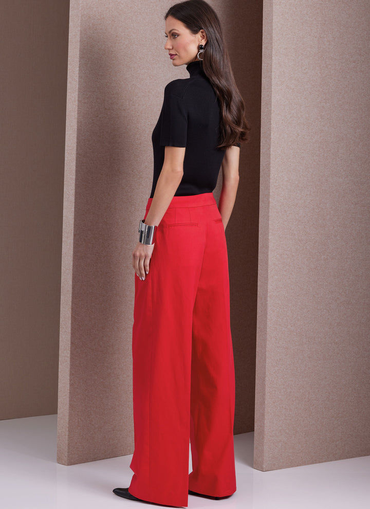 Low-rise wide-leg trousers, have shaped waistband with bar tacks, hook and bar closure, fly-zipper closing and invisible hems. View A: pleated front, side seam pockets and is loose fitting through the hips. View B: flat front and fitted through the hips. Sew Rating: Average.