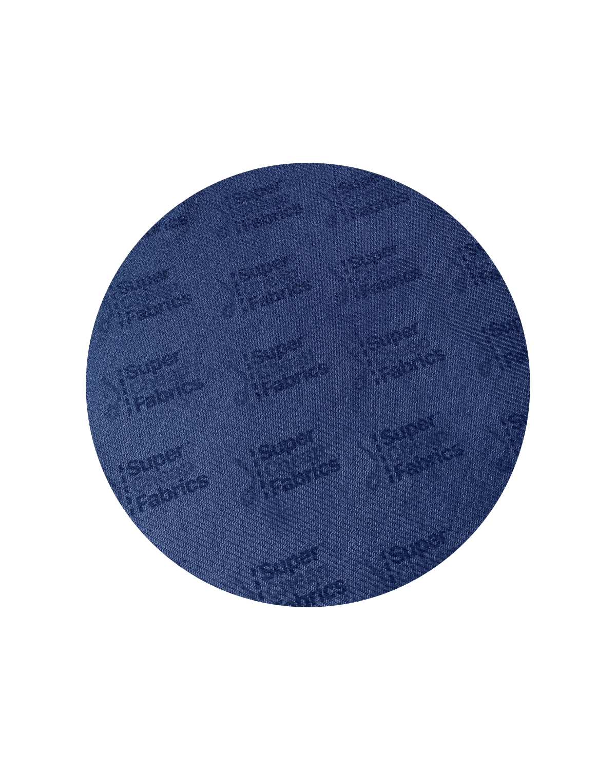 A close-up image of a circular fabric swatch in navy blue, featuring the repeated text "Super Cheap Fabrics" printed throughout in a slightly darker shade of blue. The texture of this lightweight Plain Mesh - Navy - 160cm fabric is visibly detailed.