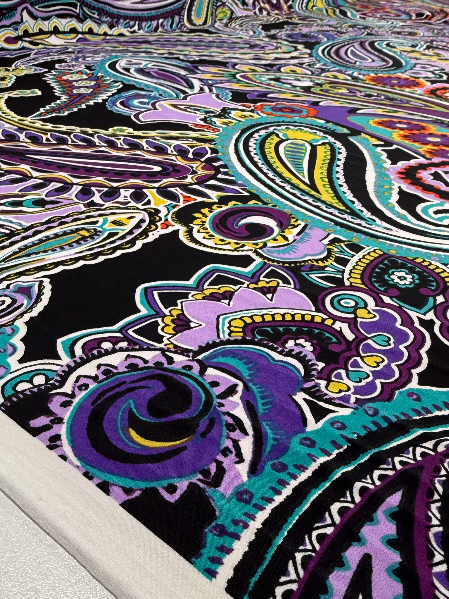 Our Printed Lycra is a Polyester/Spandex fabric that has a two-way stretch and comes in a variety of beautiful prints! Printed Lycra is a medium-weight fabric, has good durability and stretch, and washes well. Our Lycras are perfect for making tops, dresses, skirts, pants, accessories, and even childrenswear.