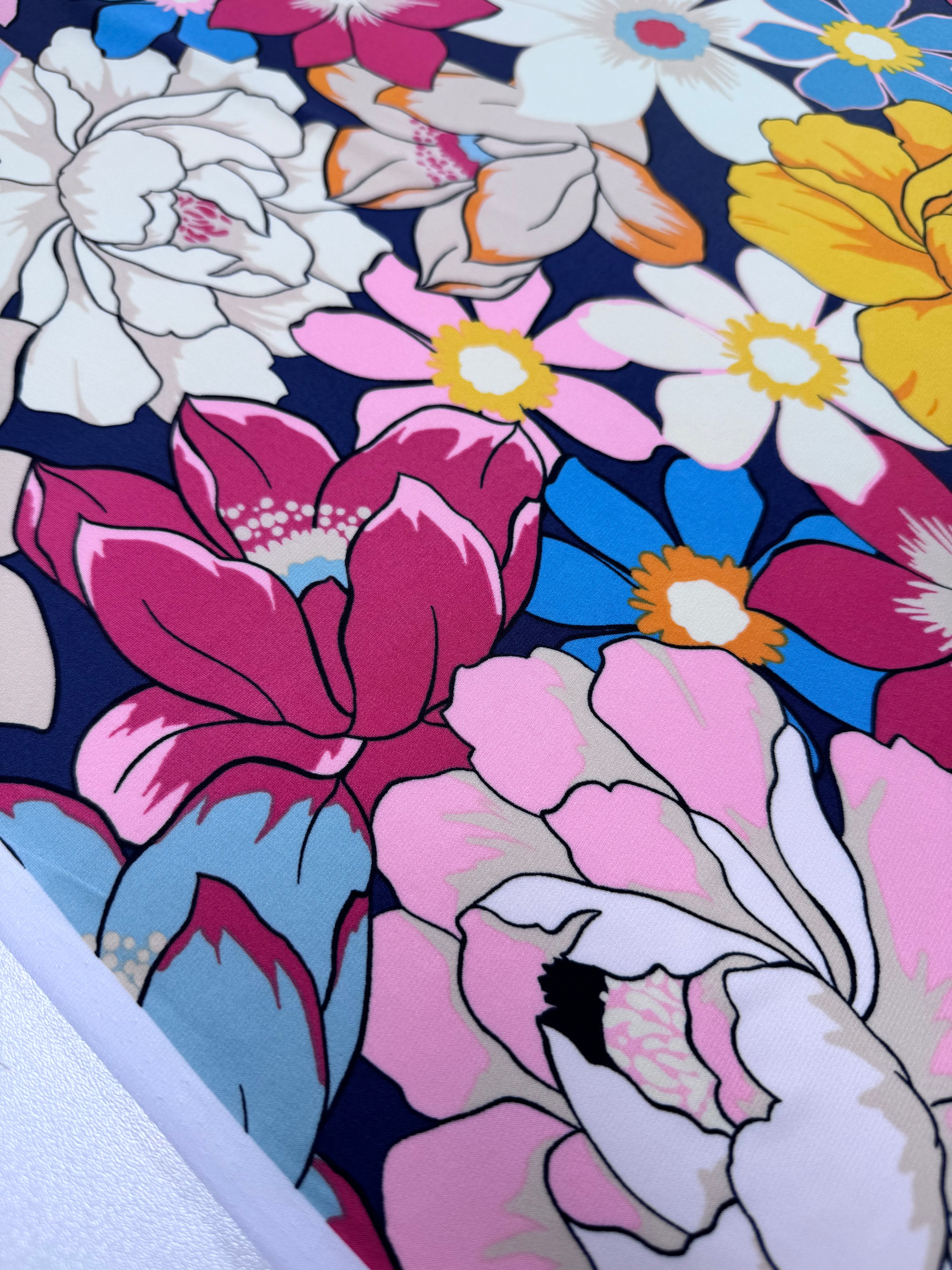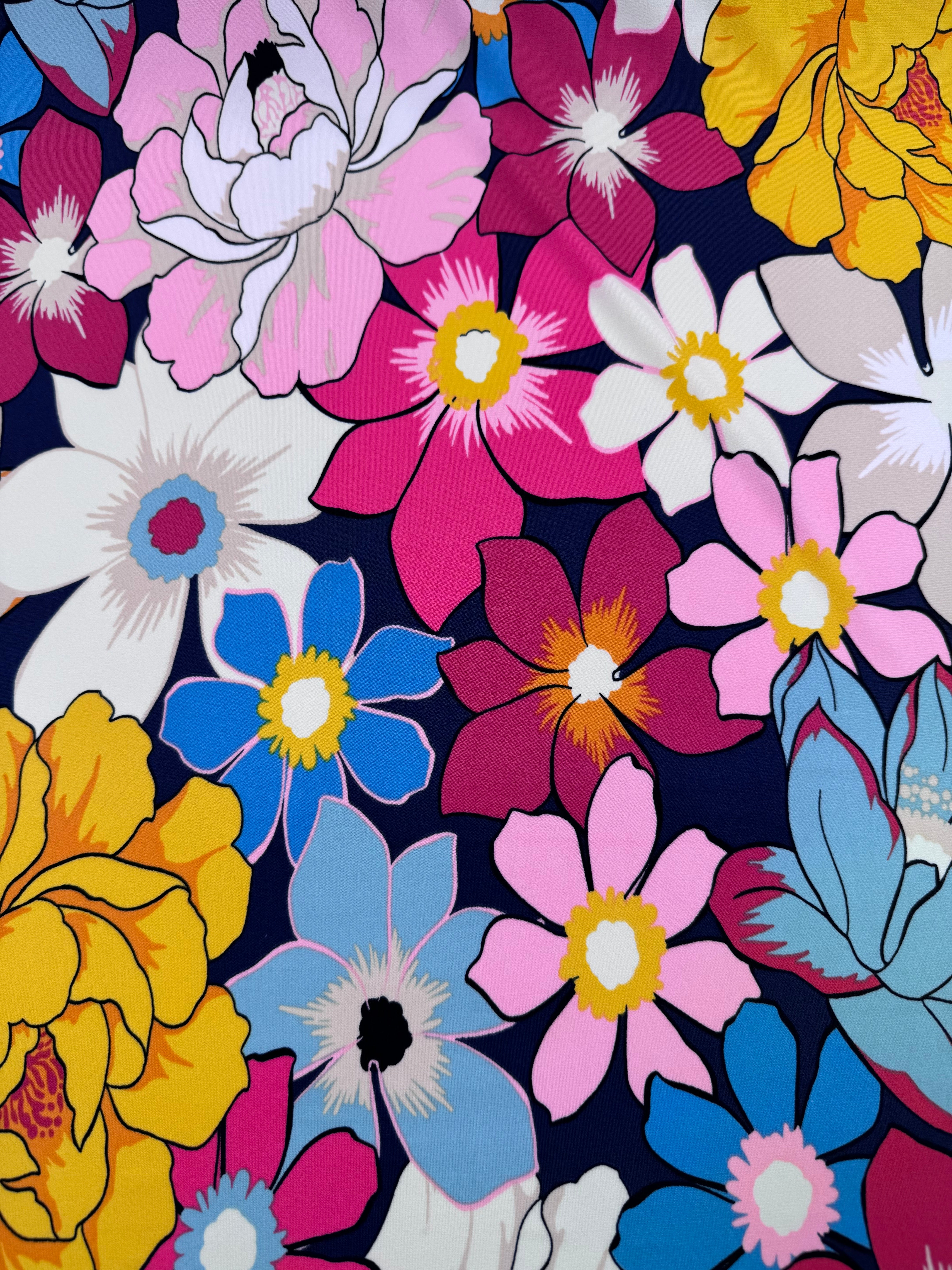 Our Printed Lycra is a Polyester/Spandex fabric that has a two-way stretch and comes in a variety of beautiful prints! Printed Lycra is a medium-weight fabric, has good durability and stretch, and washes well. Our Lycras are perfect for making tops, dresses, skirts, pants, accessories, and even childrenswear. An intricate multi-coloured paisley with teal, orange, pink, and green accents.