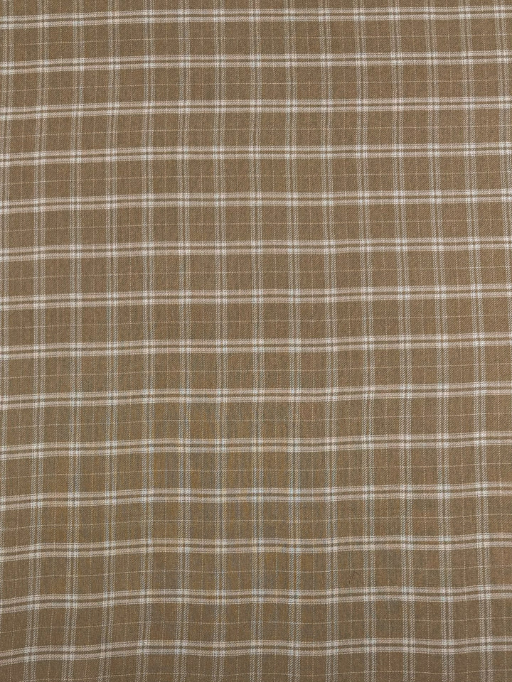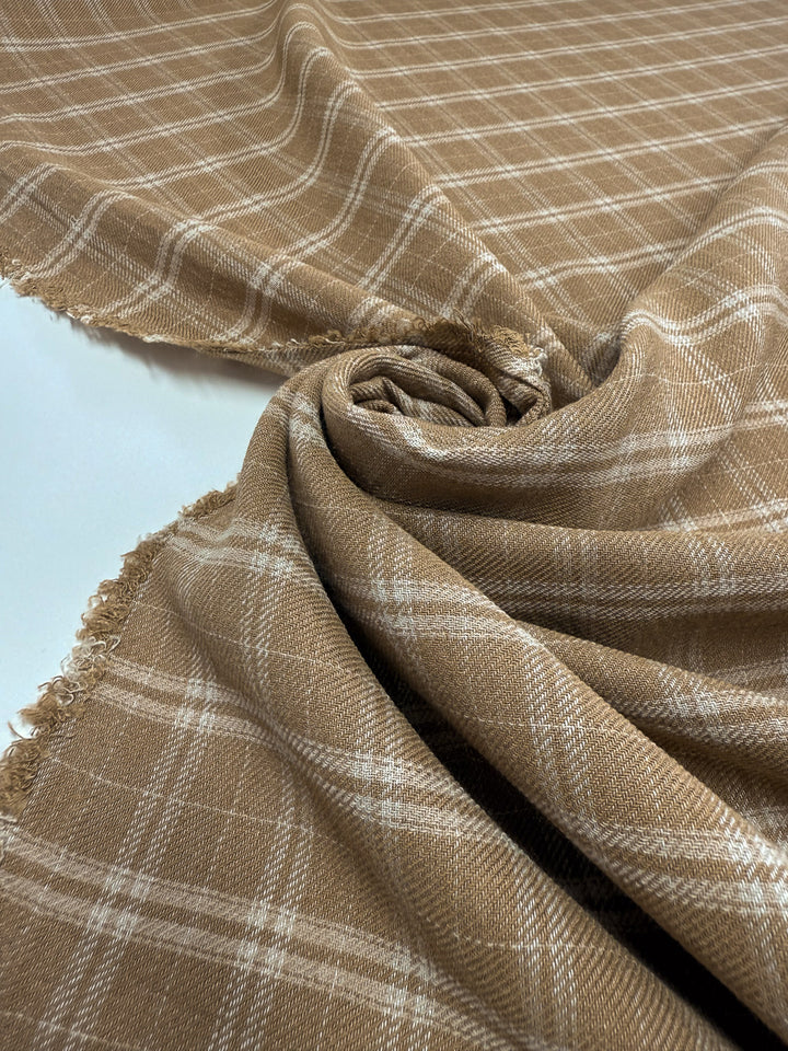 A light to medium weight soft checked twill tweed pure linen with muted tan and white.