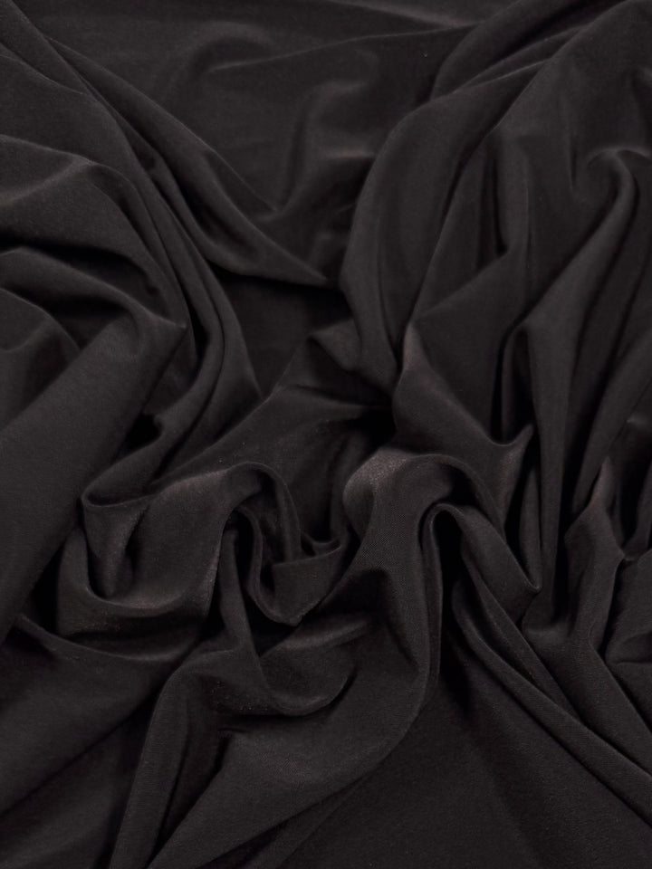 A mannequin is draped in a dark chocolate color, one-shoulder polyester fabric called Slinky Knit - Chocolate - 135cm by Super Cheap Fabrics that wraps around the torso. The smooth medium weight fabric appears to have a slight sheen, creating a subtle textured pattern under the light. The background is plain and grayish, focusing attention on the fabric and mannequin.
