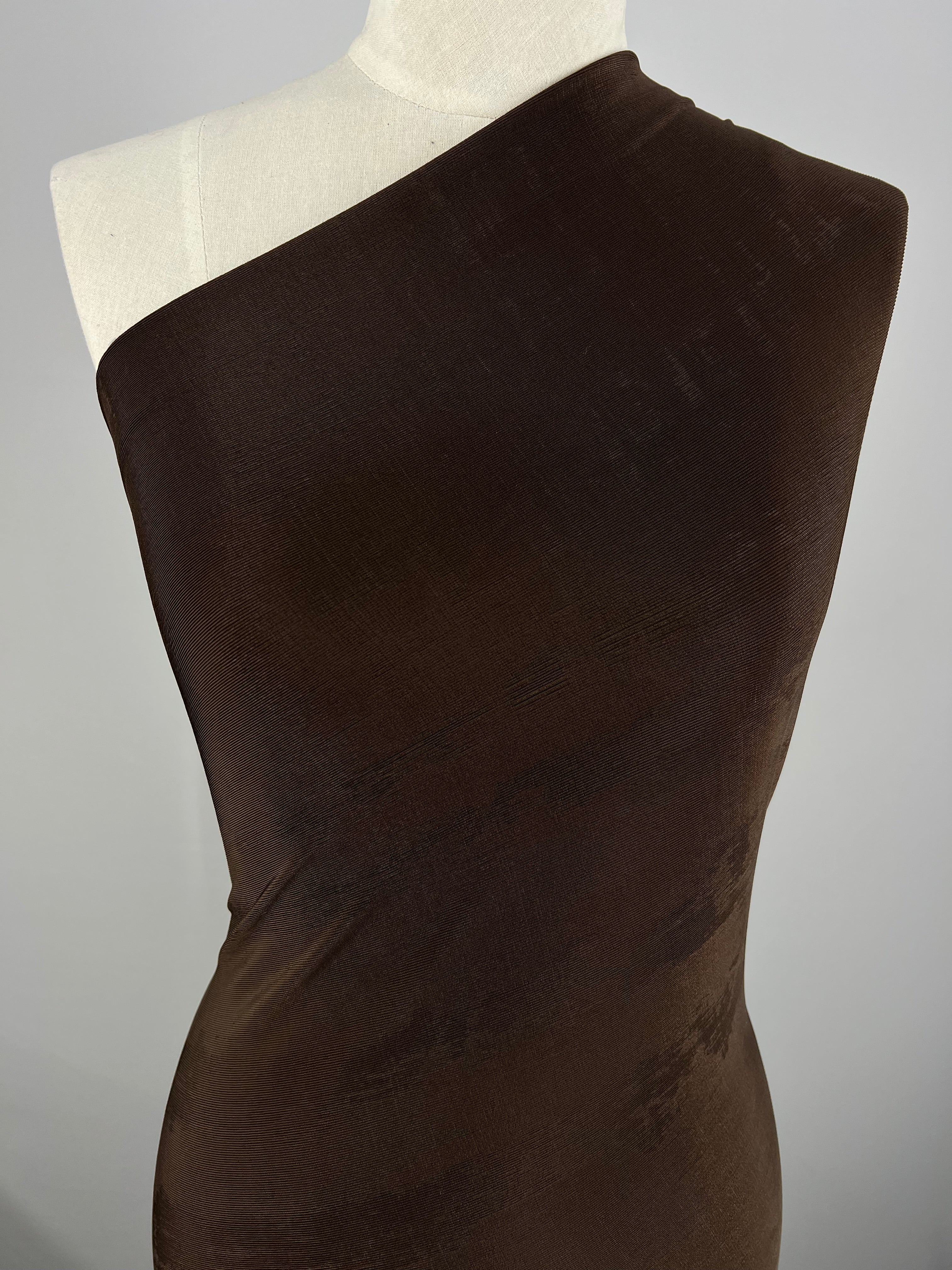 A close-up of Slinky Knit - Chocolate - 135cm by Super Cheap Fabrics with visible ribbed texture, gathered and draped in soft folds and wrinkles. The medium-weight material appears soft and plush, displaying its characteristic horizontal lines and creating a sense of depth and richness.