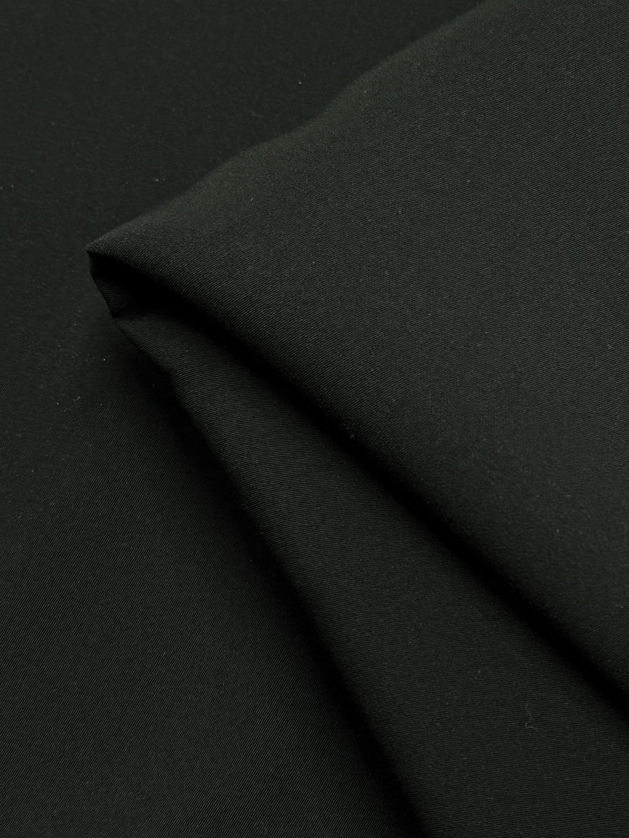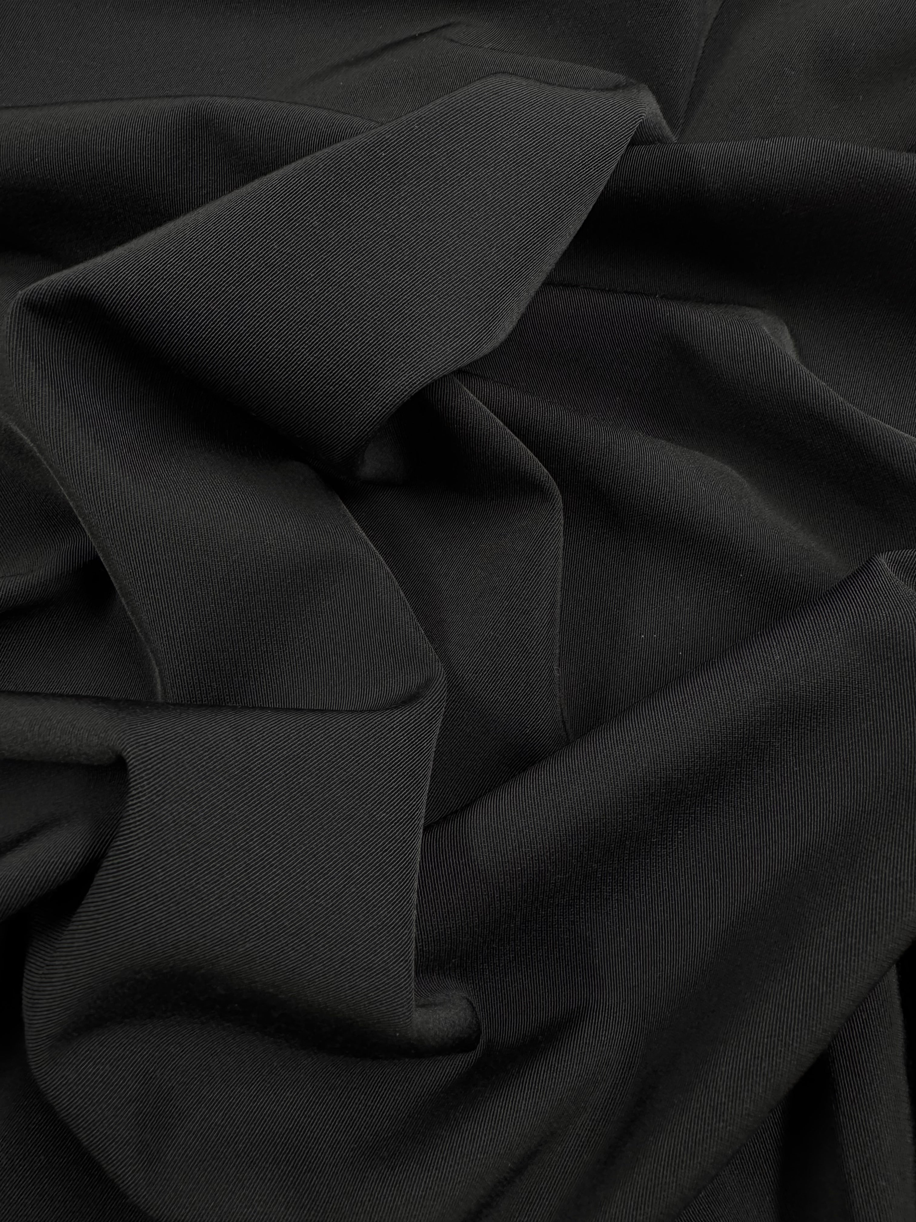 Close-up of Super Cheap Fabrics' Suiting - Black 4 Way- 142cm, showing its soft medium-weight texture and gentle folds that form wavy, overlapping patterns characteristic of 4-way stretch fabric.