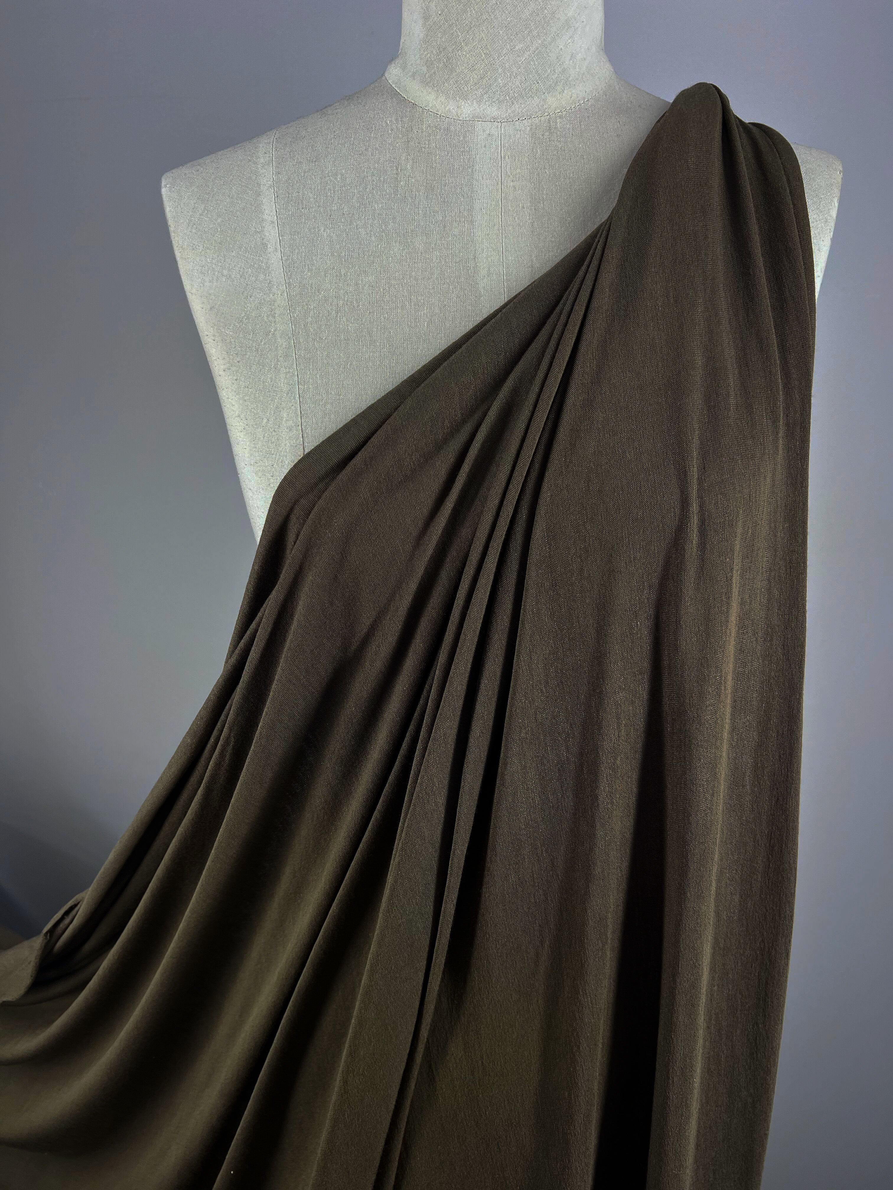 A mannequin wears the Summer Cotton Knit - Sea Turtle from Super Cheap Fabrics, featuring dark brown lightweight cotton fabric that elegantly drapes asymmetrically from the shoulder, showcasing its texture and sophisticated folds against a muted gray background.