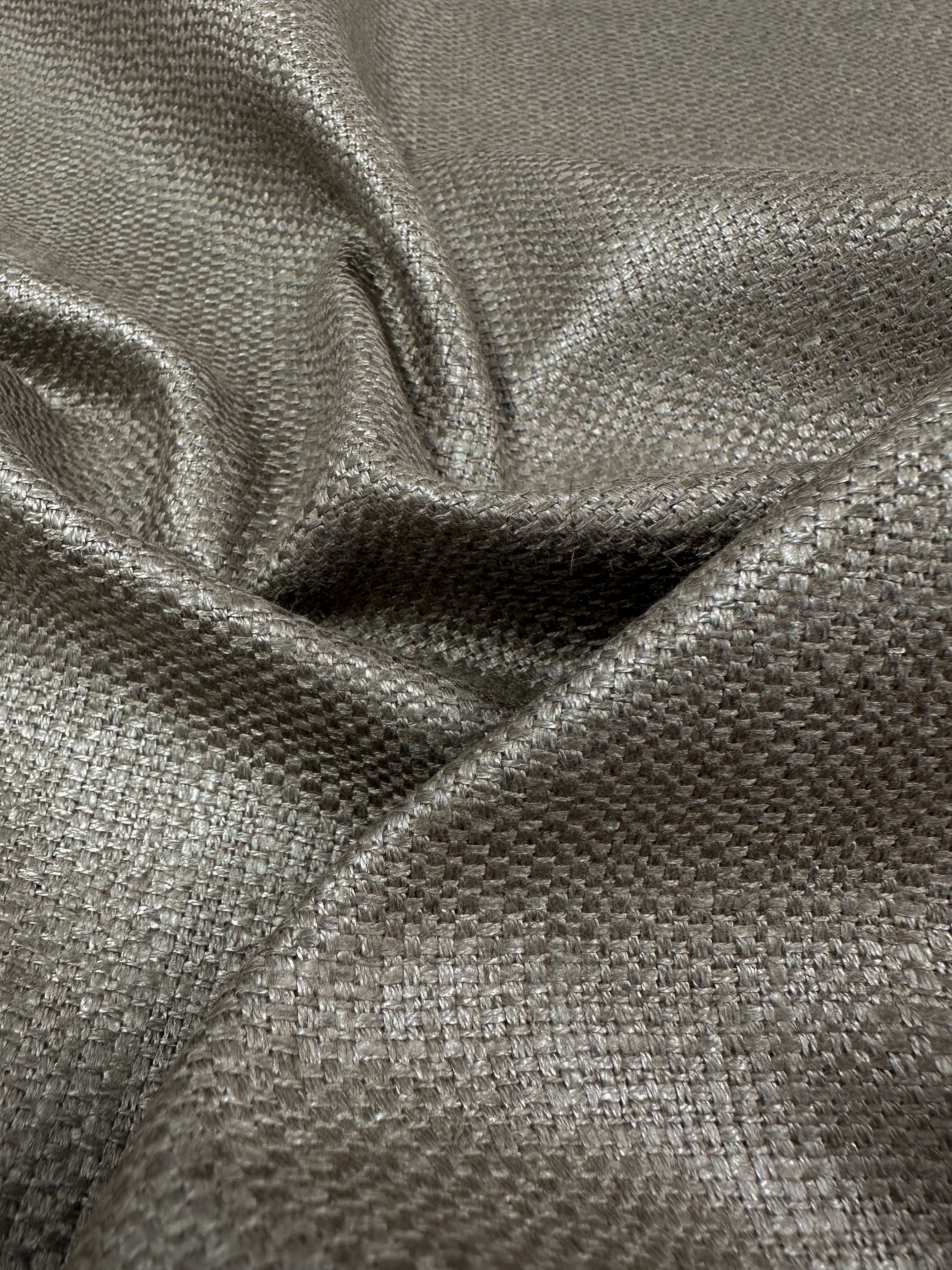 This close-up showcases the 'Upholstery Basket Weave - Dorian Putty - 145cm' by Super Cheap Fabrics, featuring metallic silver fabric with a textured basket weave. The heavyweight material drapes in gentle folds, beautifully highlighting its shiny, reflective surface.