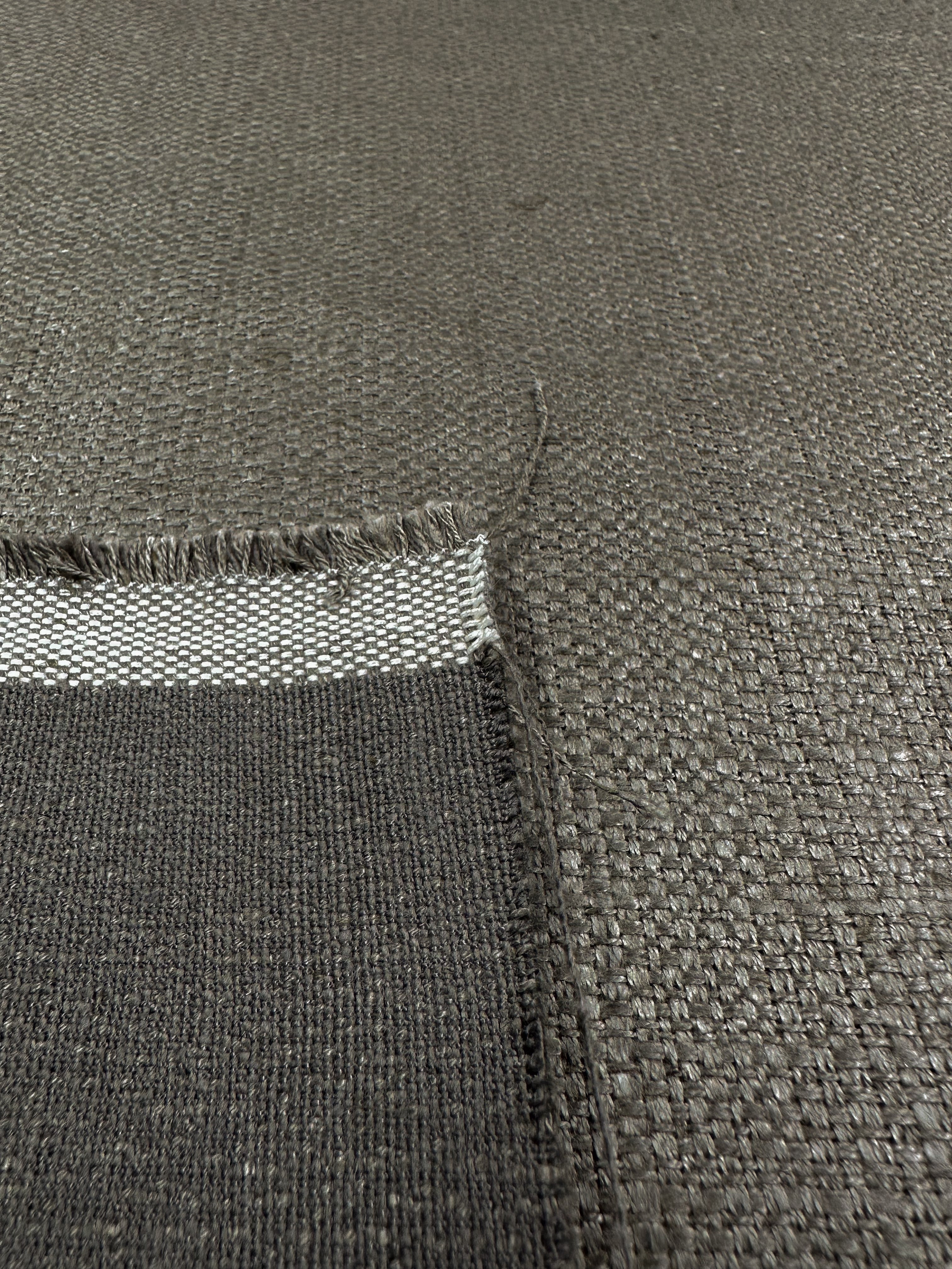 A close-up of Super Cheap Fabrics' Upholstery Basket Weave - Dorian Putty (145cm) reveals its textured, heavy-weight woven pattern. A folded corner shows a white stripe underneath, while frayed edges lend a rustic touch to this upholstery piece.
