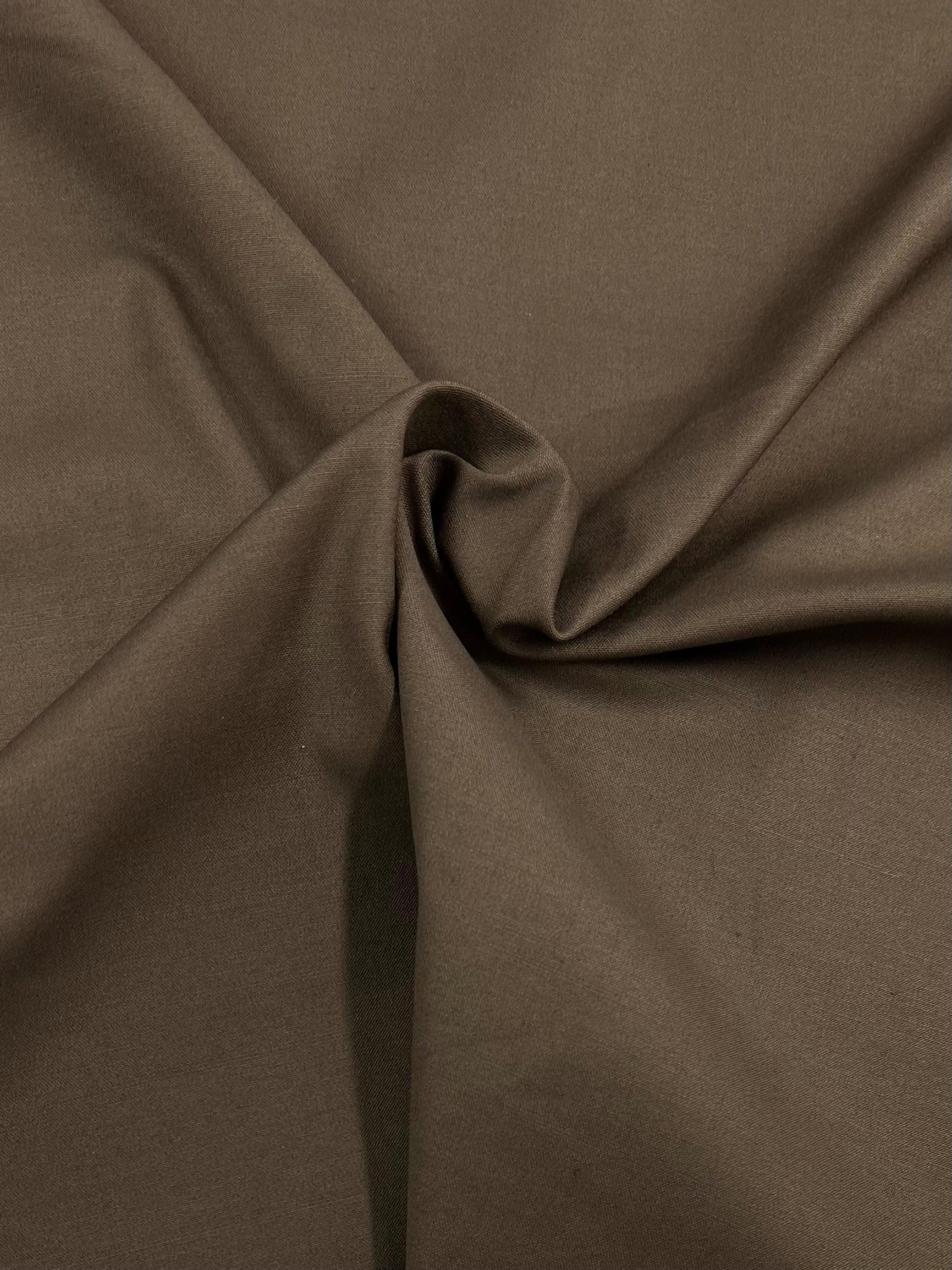 A close-up image of a brown, medium-heavy weight fabric with a subtle sheen. This 100% cotton material is gathered and twisted in the center, creating soft folds and creases that add texture to its smooth surface, ideal for workwear. The product is Cotton Sateen - Kangaroo - 118cm by Super Cheap Fabrics.