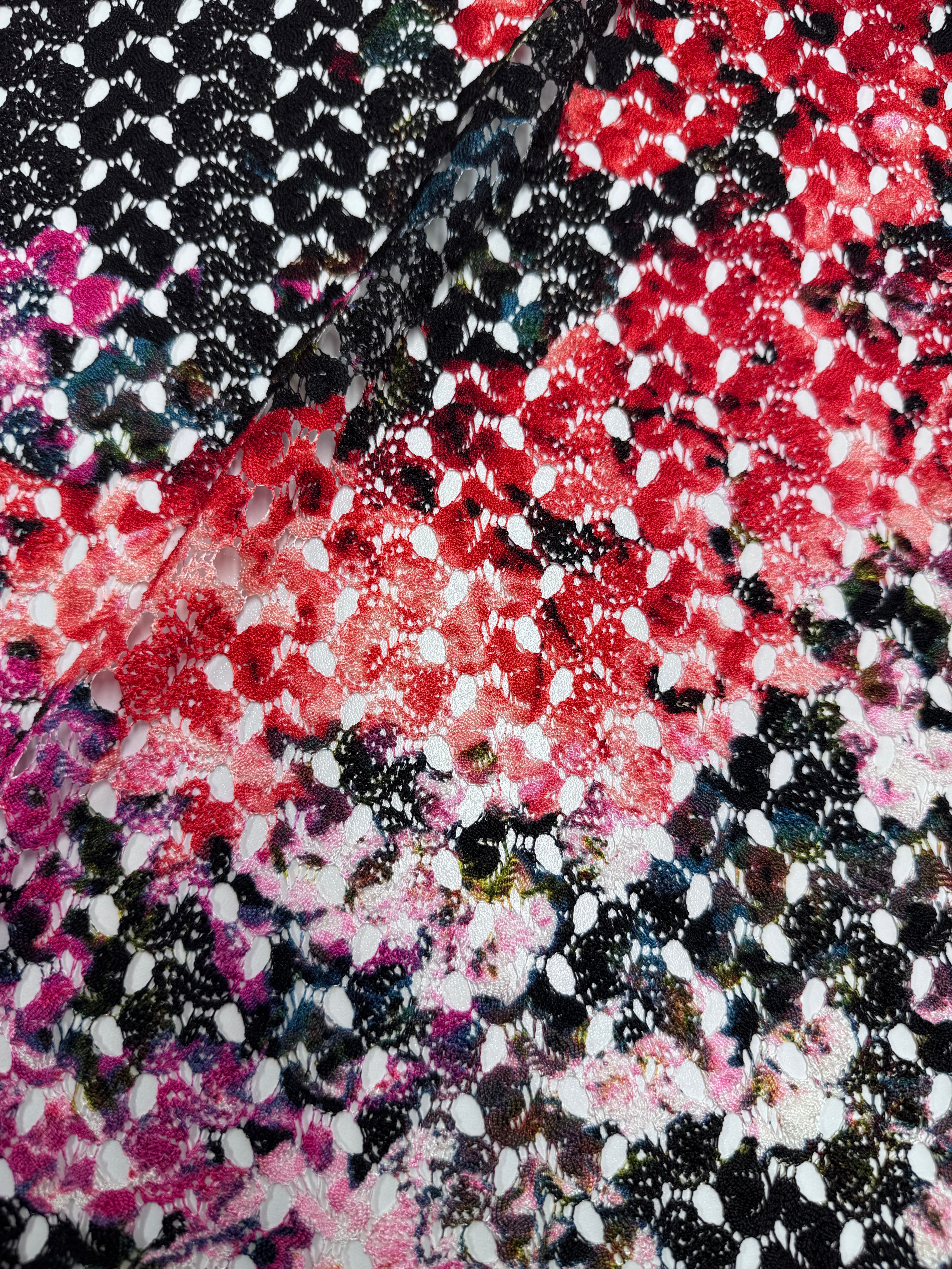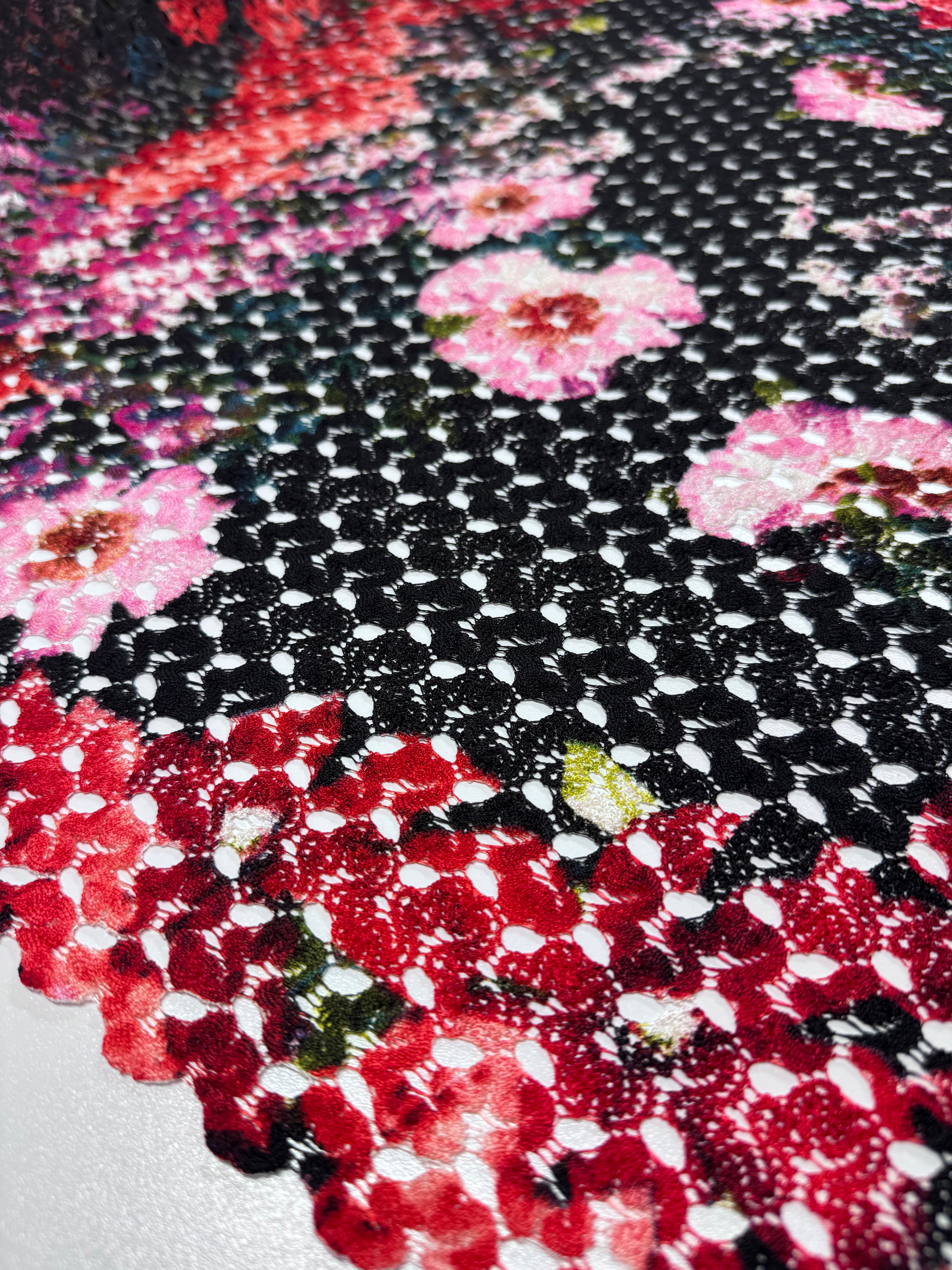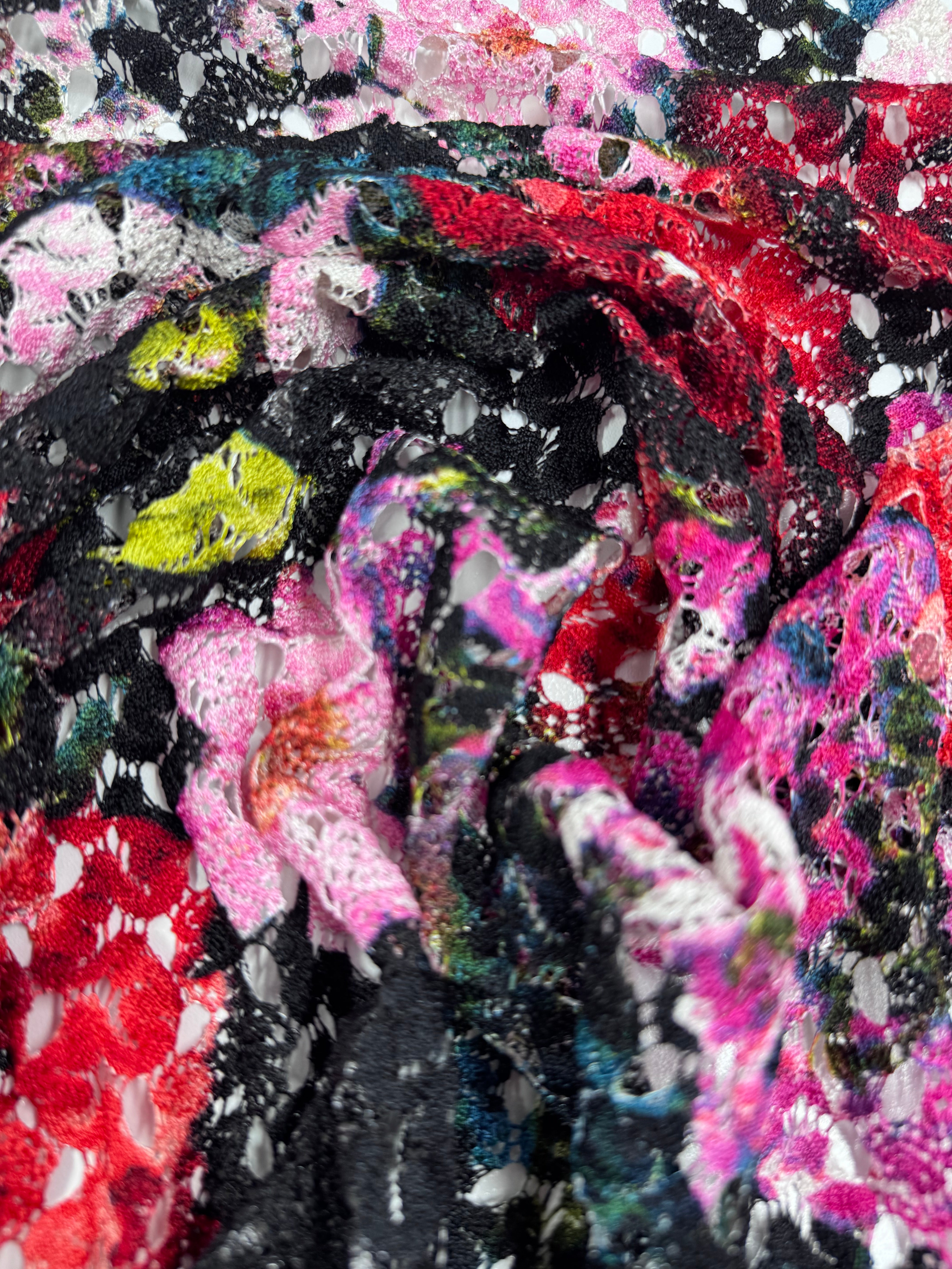 A delicate lace with a gorgeous, black lace-look print featuring neon pink and colourful floral textures, this stretchy piece boasts a beautiful drape. Perfect for beach cover and any style tops or dresses.