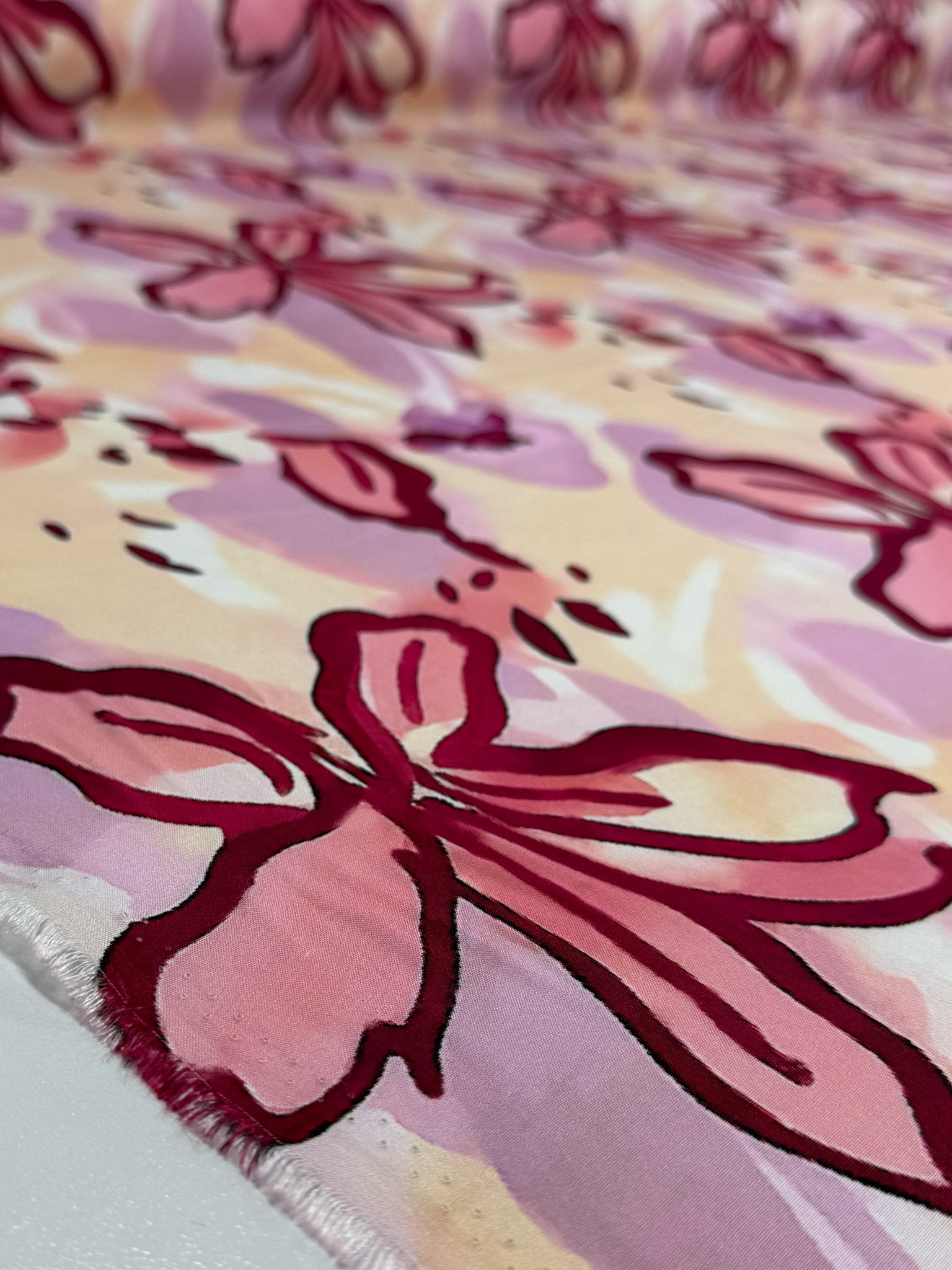 Our Designer Rayon showcases a beautiful and colourful fabric with vibrant prints that can be used for various purposes such as dresses, skirts, blouses, curtains, and more. Our collection showcases a soft, lightweight fabric with a smooth drape and a luxurious feel. Overall, rayon fabric offers both comfort and style, making it a versatile choice for any project. Rosewater features painterly floral motifs in soft blush and lilac tones, outlined in rich raspberry over a gentle cream base.