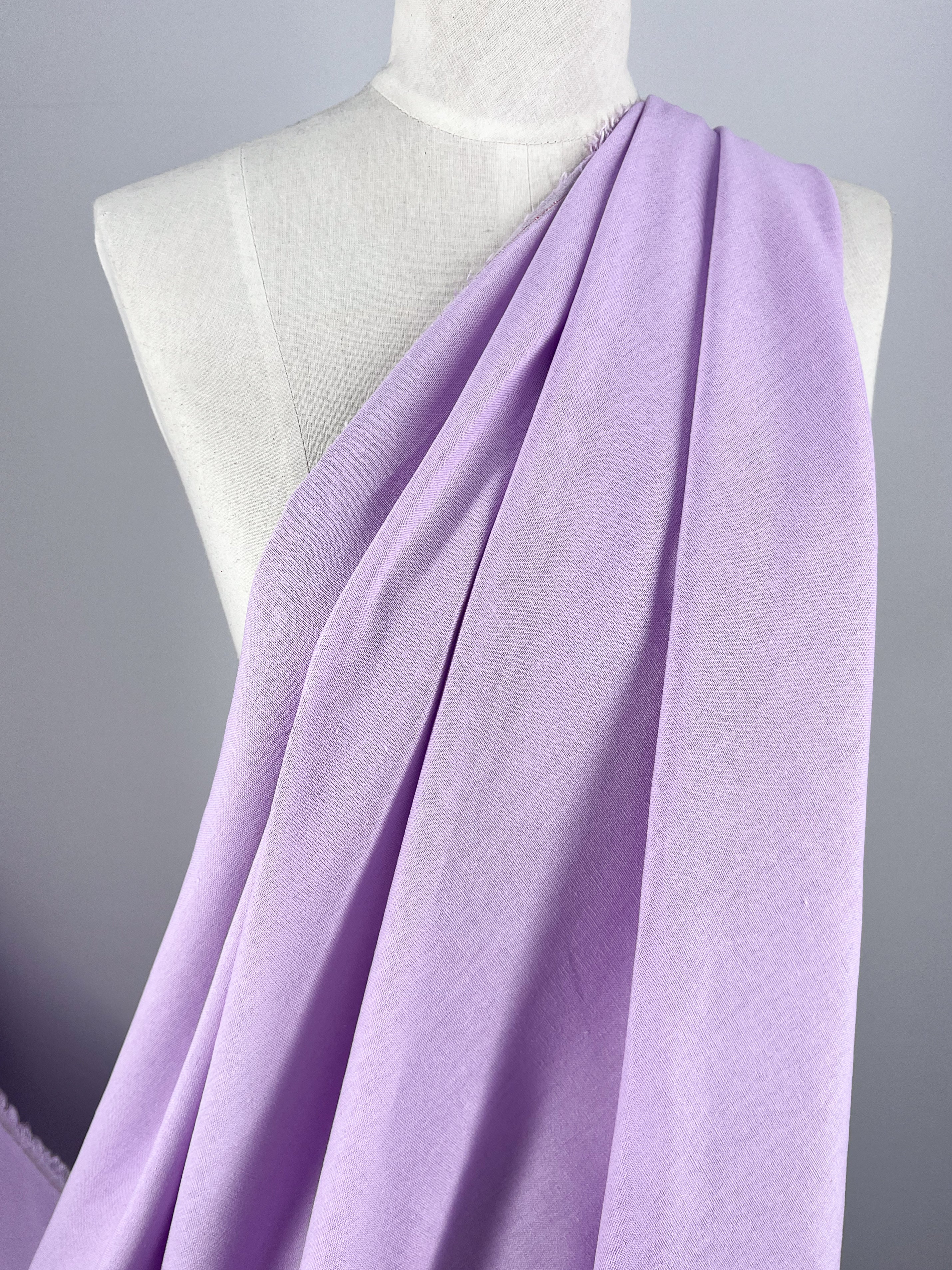 A mannequin is elegantly adorned with Super Cheap Fabrics' Premium Linen Cotton in "Orchid Bouquet," a lightweight, light purple fabric. Draped diagonally across the torso, the fabric showcases its soft texture and gentle folds against a plain gray background, highlighting its exquisite beauty.