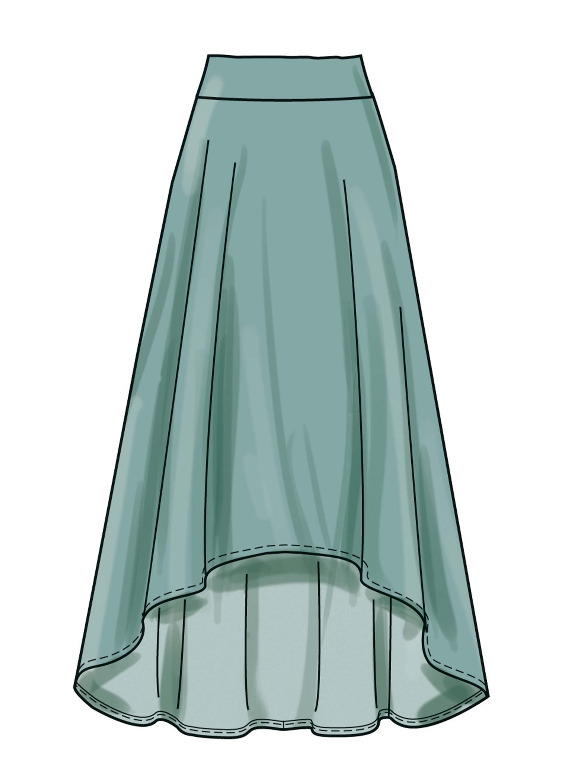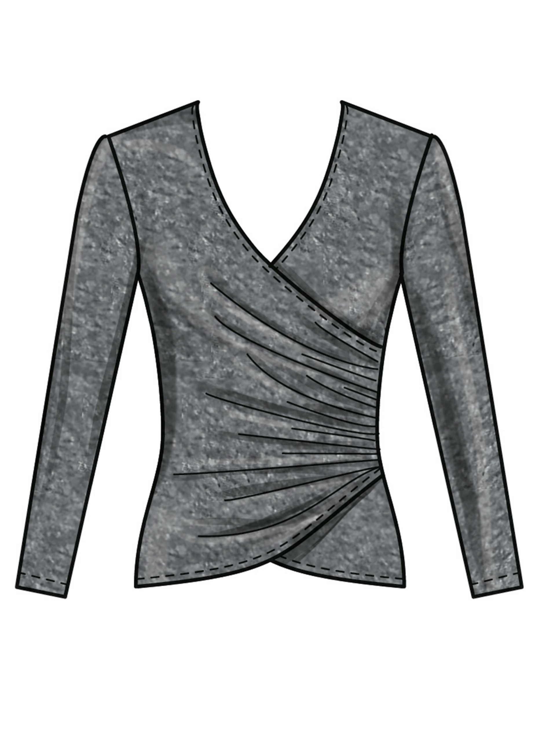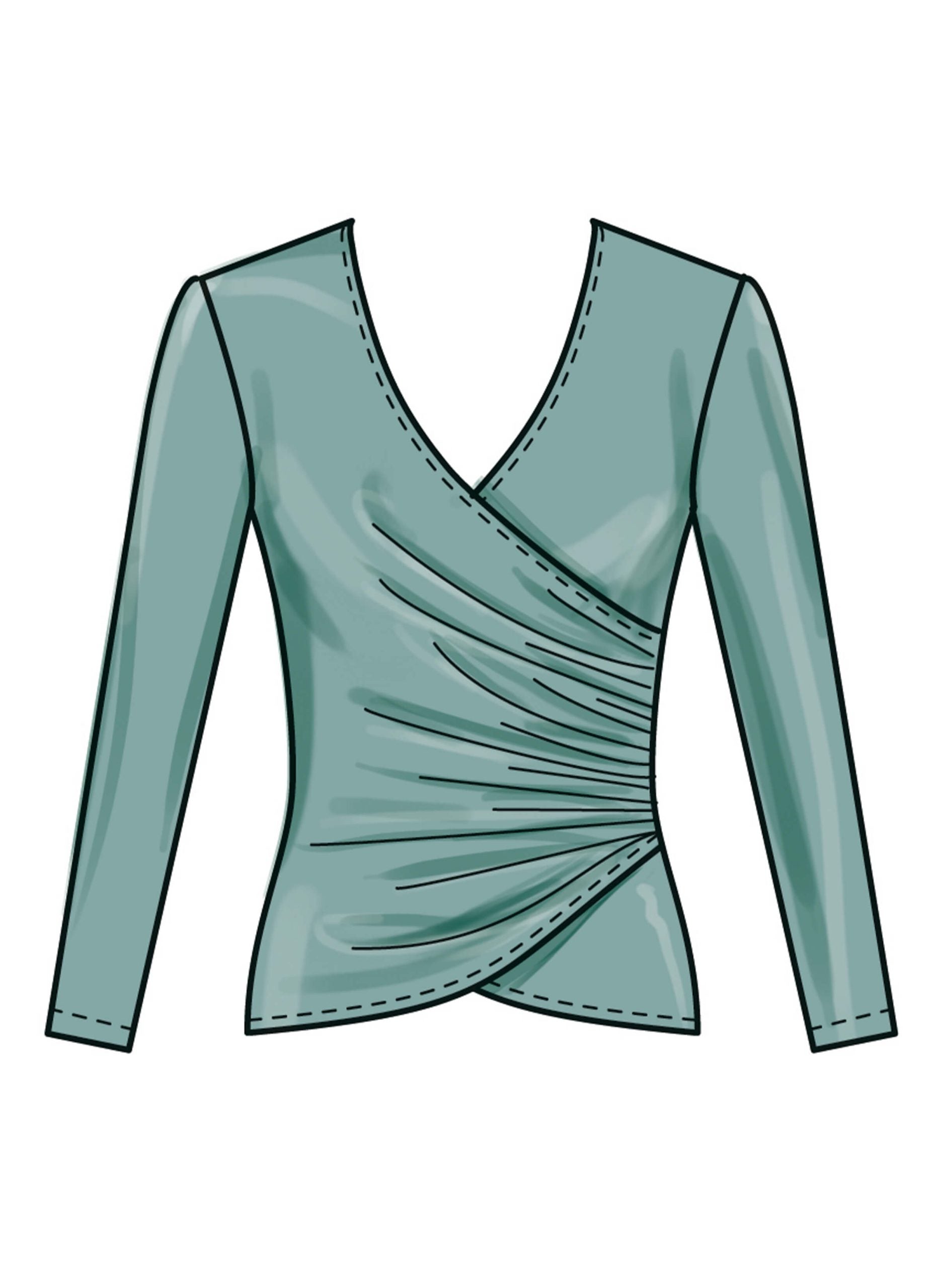 Close-fitting, pullover tops have wrap front with left side gathers, sleeve variations and narrow hems. Skirts (below waist) have elasticised waist, self-lined yoke variations and narrow hem. View D has high-low hem, wrong side shows. View E has gathered yoke.