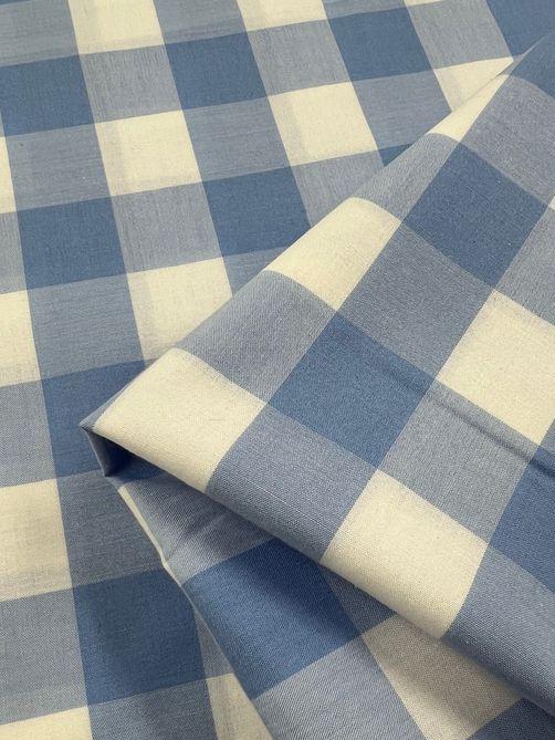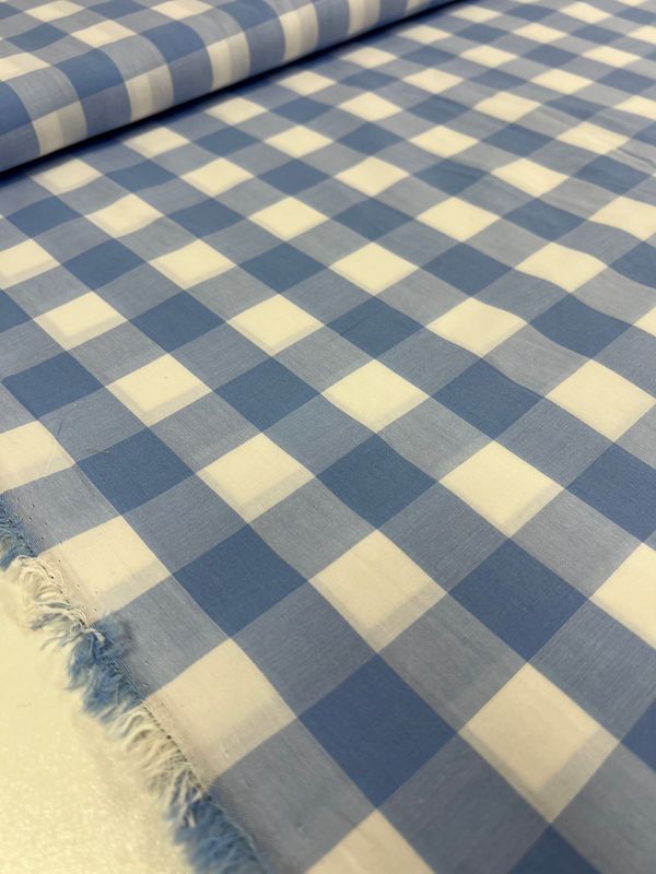 Close-up of Super Cheap Fabrics' Cotton Gingham XL - Windsurfer, showcasing a blue and white checkered, lightweight fabric folded neatly. The pattern features alternating square blocks that form a classic gingham design. With a smooth texture, the fabric appears to be made from printed natural cotton fibers and measures 112cm in width.