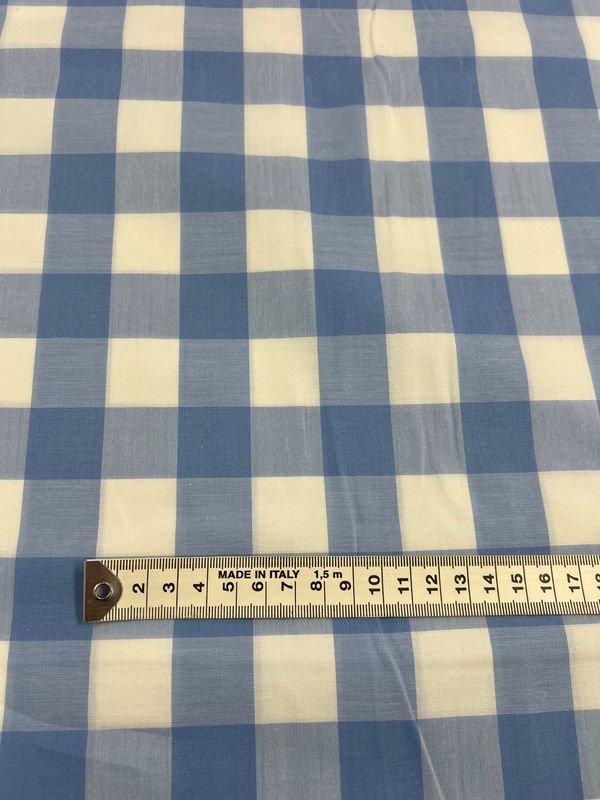 A close-up image showcases the Cotton Gingham XL - Windsurfer fabric from Super Cheap Fabrics, featuring a blue and white checkered pattern. A metal ruler is placed at the bottom, displaying measurements in centimeters from 0 to 13, emphasizing the fabric’s evenly sized squares and its lightweight, natural texture.