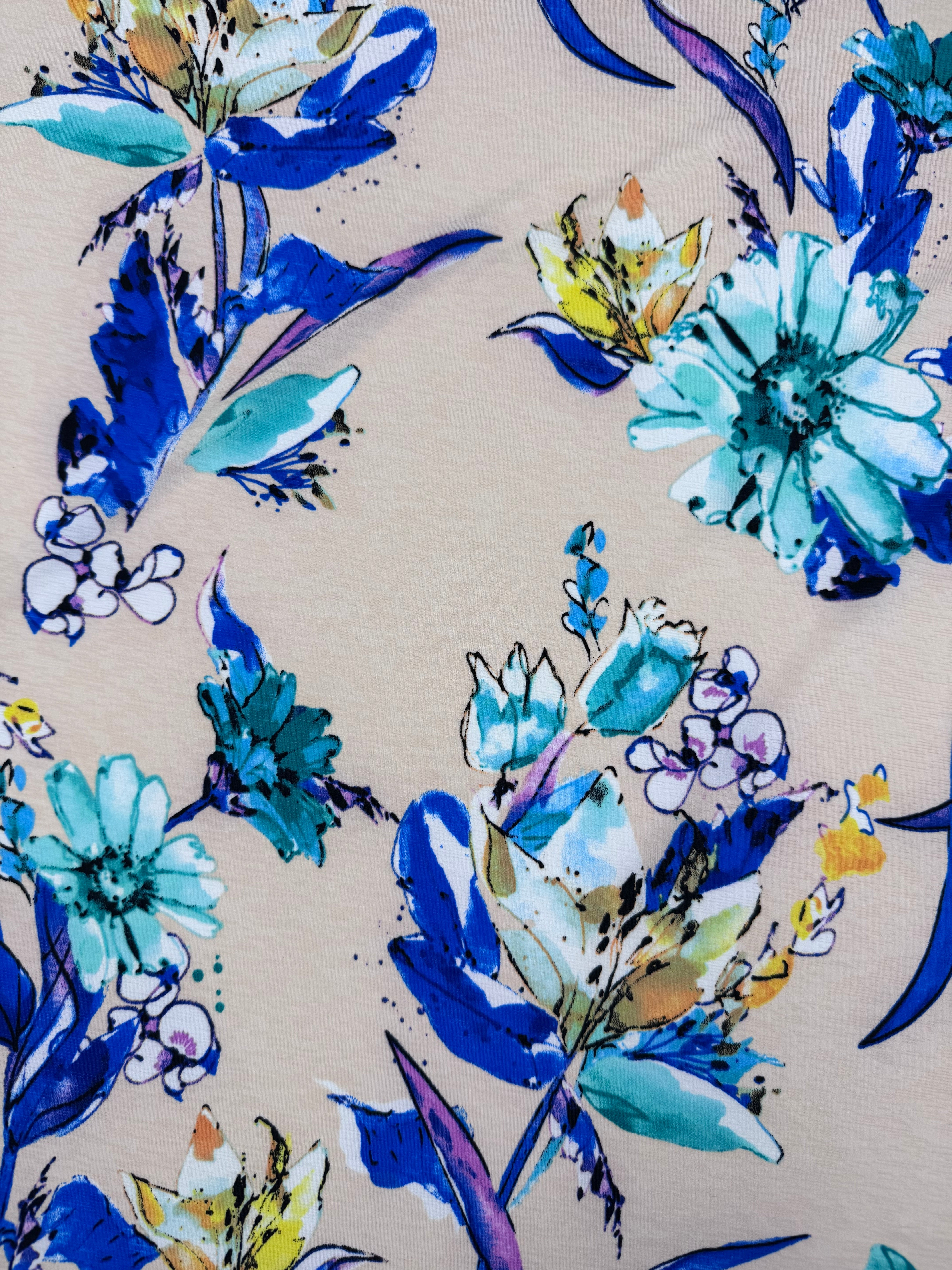 Our Printed Lycra is a Polyester/Spandex fabric that has a two-way stretch and comes in a variety of beautiful prints! Printed Lycra is a medium-weight fabric, has good durability and stretch, and washes well. Our Lycras are perfect for making tops, dresses, skirts, pants, accessories, and even childrenswear.