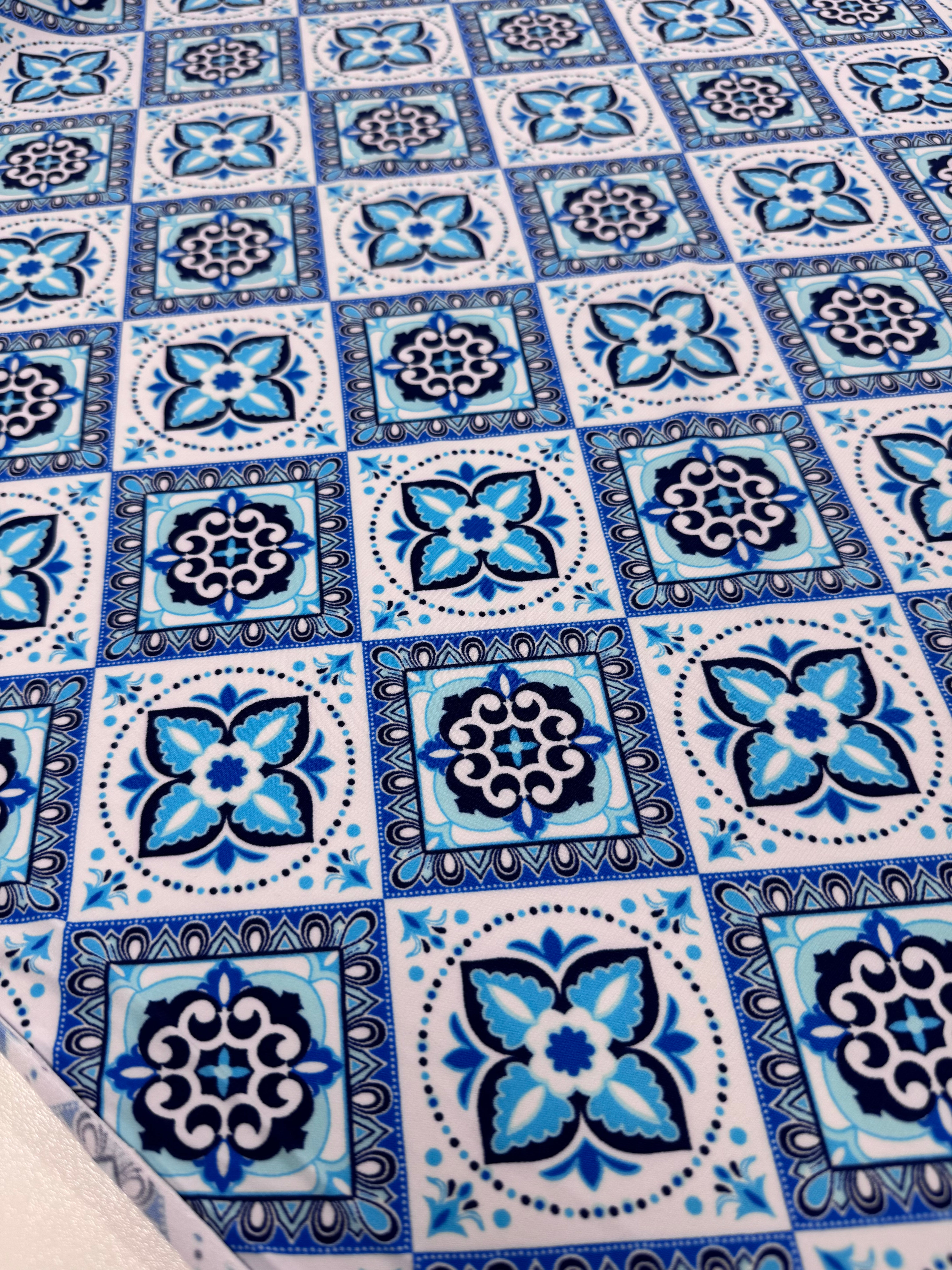 Our Printed Lycra is a Polyester/Spandex fabric that has a two-way stretch and comes in a variety of beautiful prints! Printed Lycra is a medium-weight fabric, has good durability and stretch, and washes well. Our Lycras are perfect for making tops, dresses, skirts, pants, accessories, and even childrenswear. An intricate multi-coloured paisley with teal, orange, pink, and green accents.