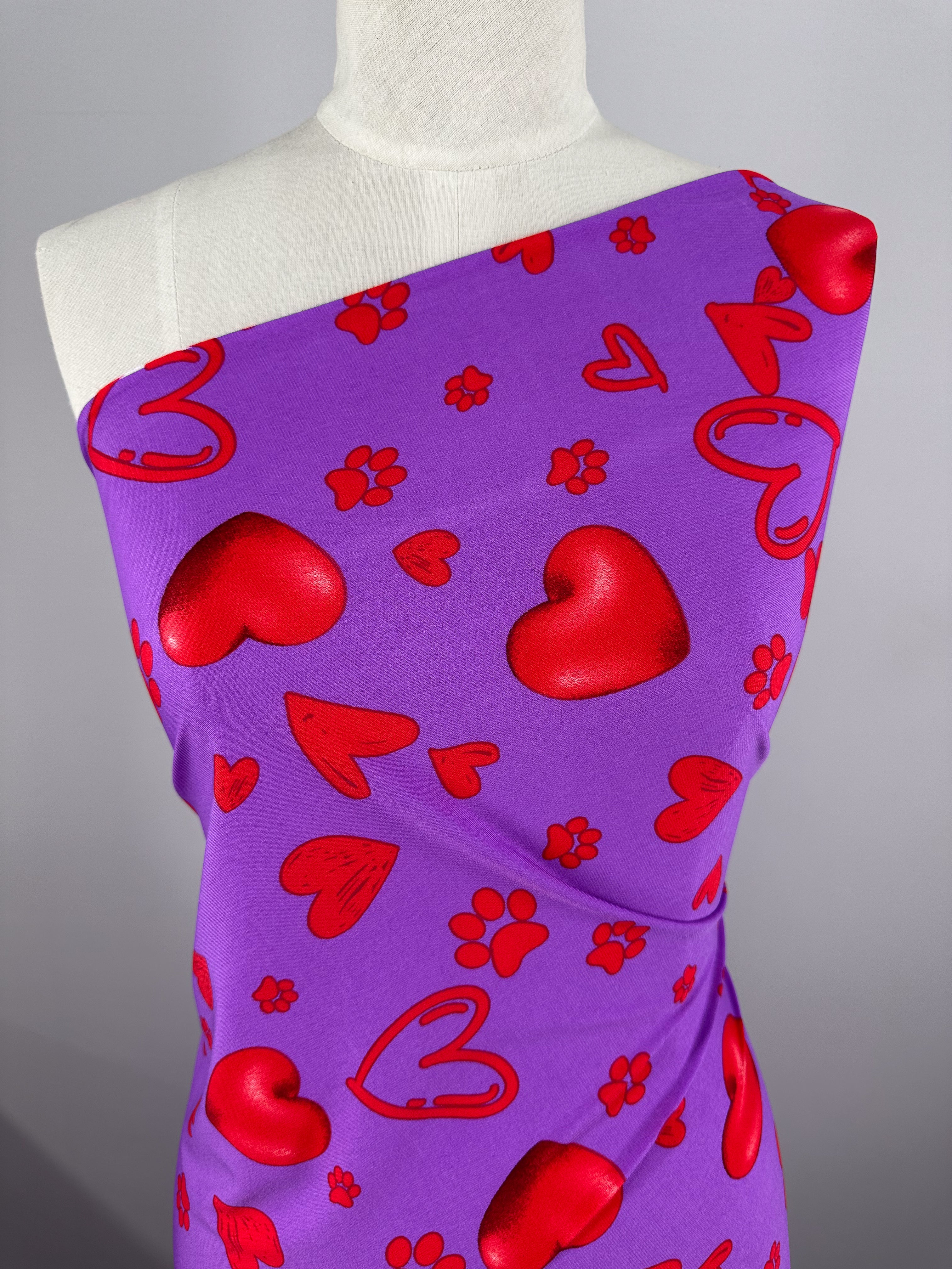 Printed Lycra - Love Riot - 150cm by Super Cheap Fabrics features red hearts and playful paw prints on purple, creating a vibrant, lively pattern—perfect for bold, eye-catching projects.