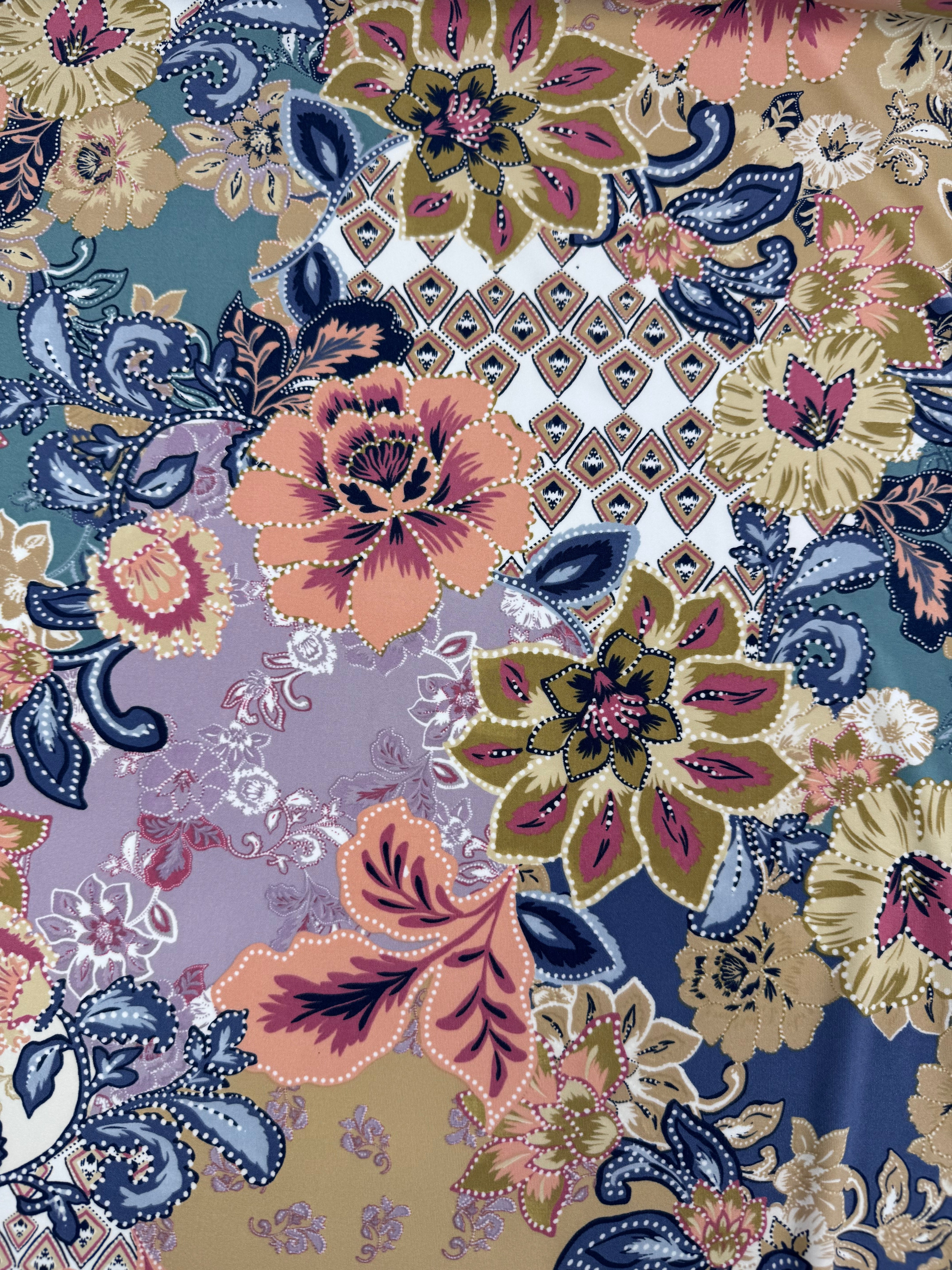 Our Printed Lycra is a Polyester/Spandex fabric that has a two-way stretch and comes in a variety of beautiful prints! Printed Lycra is a medium-weight fabric, has good durability and stretch, and washes well. Our Lycras are perfect for making tops, dresses, skirts, pants, accessories, and even childrenswear.