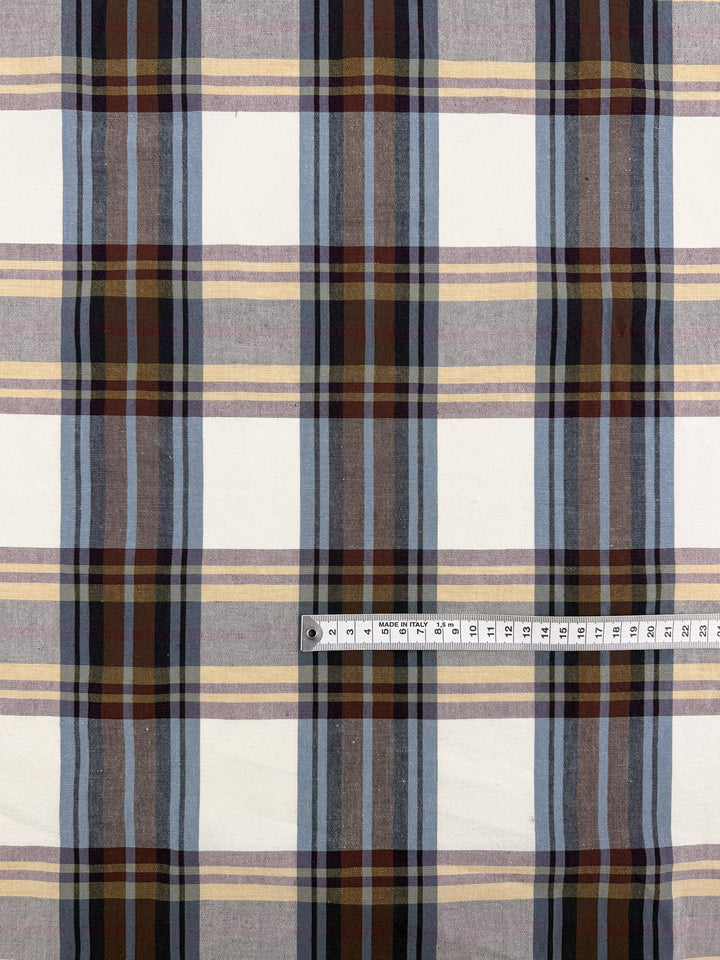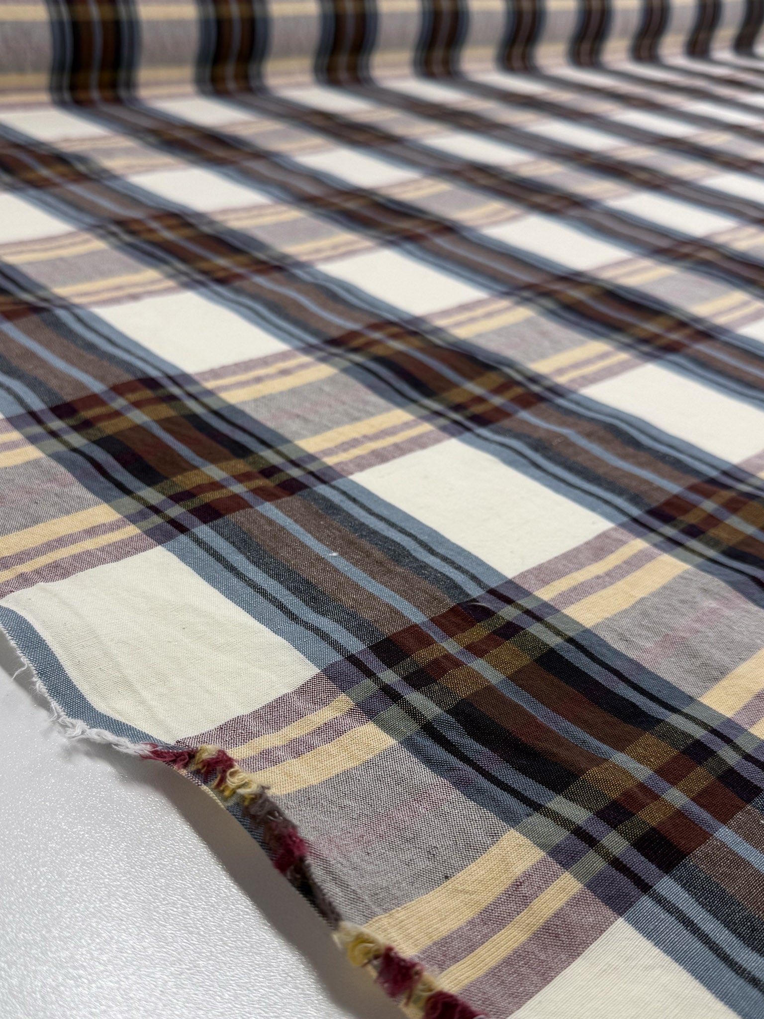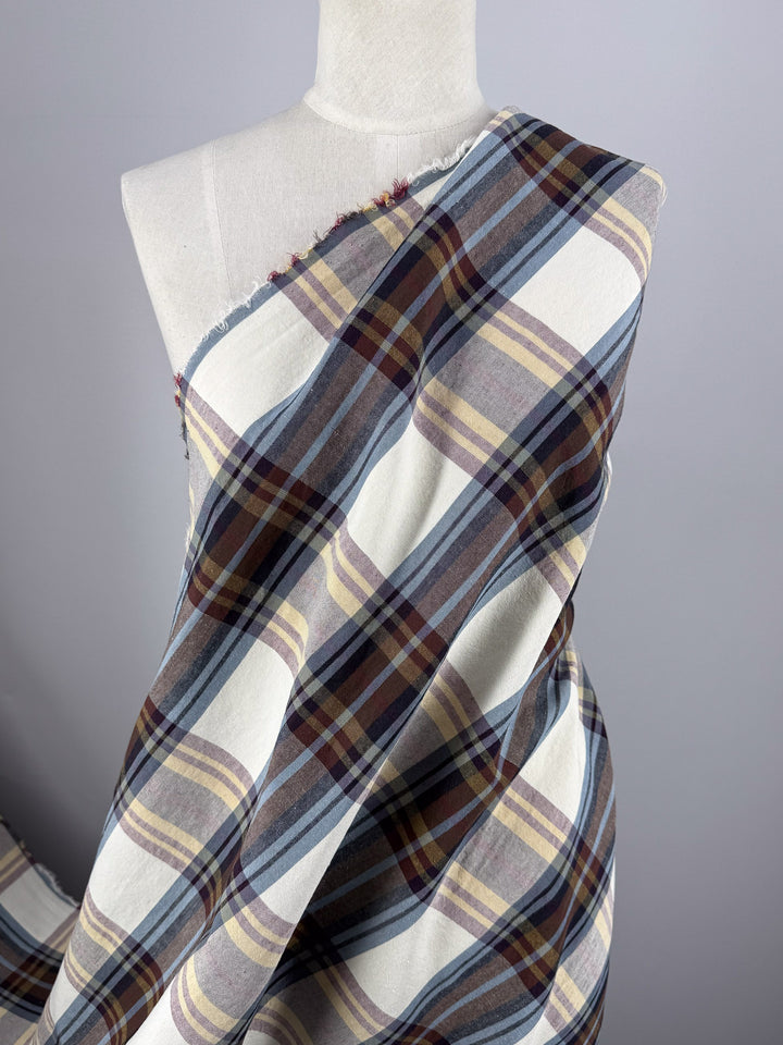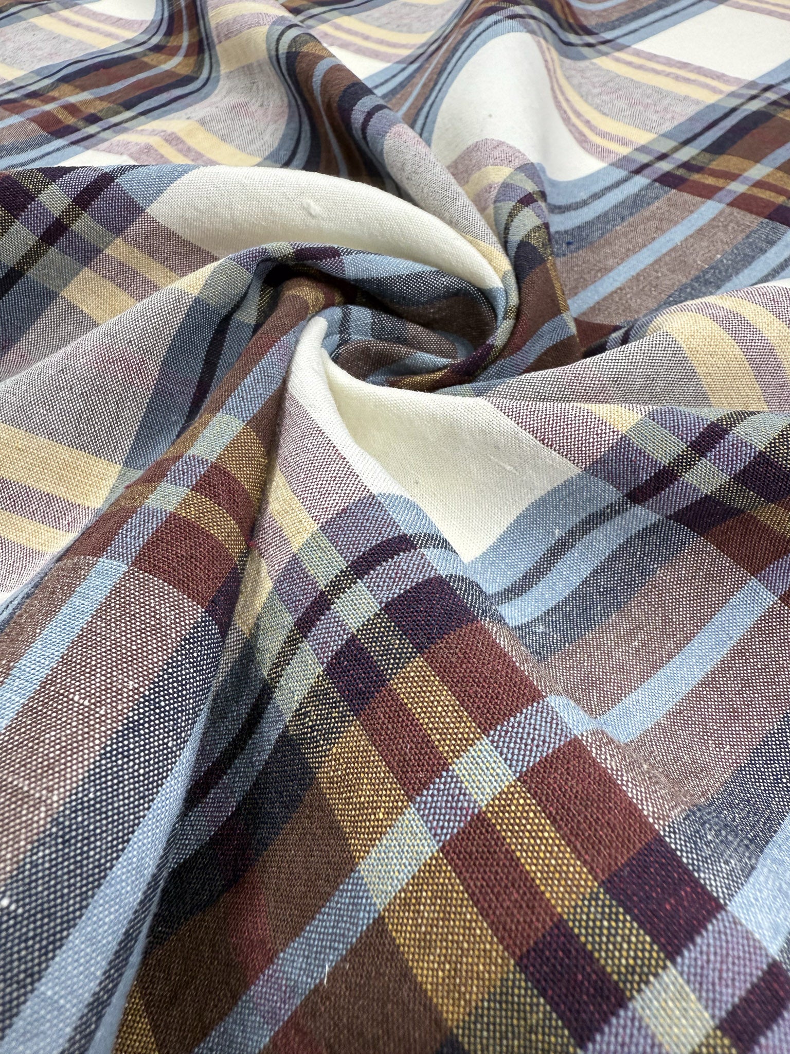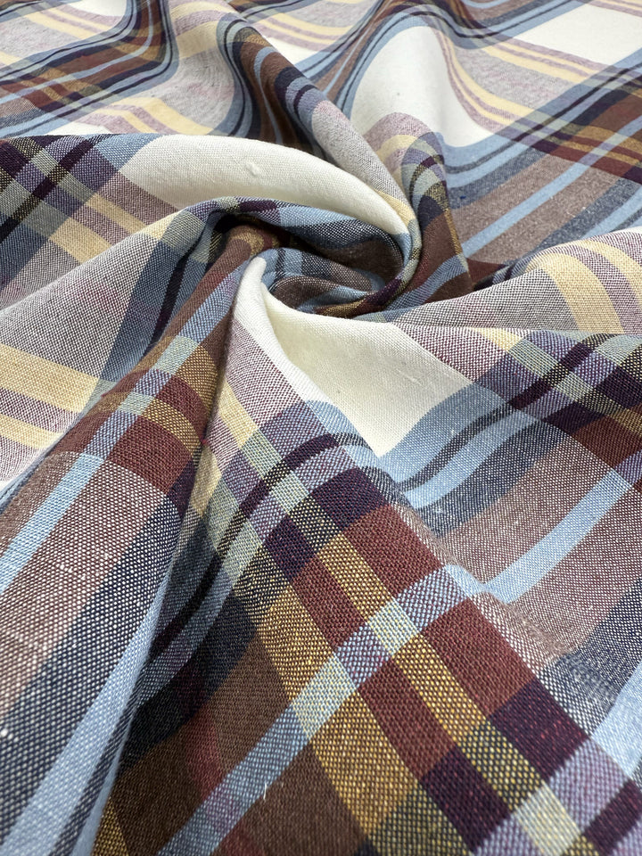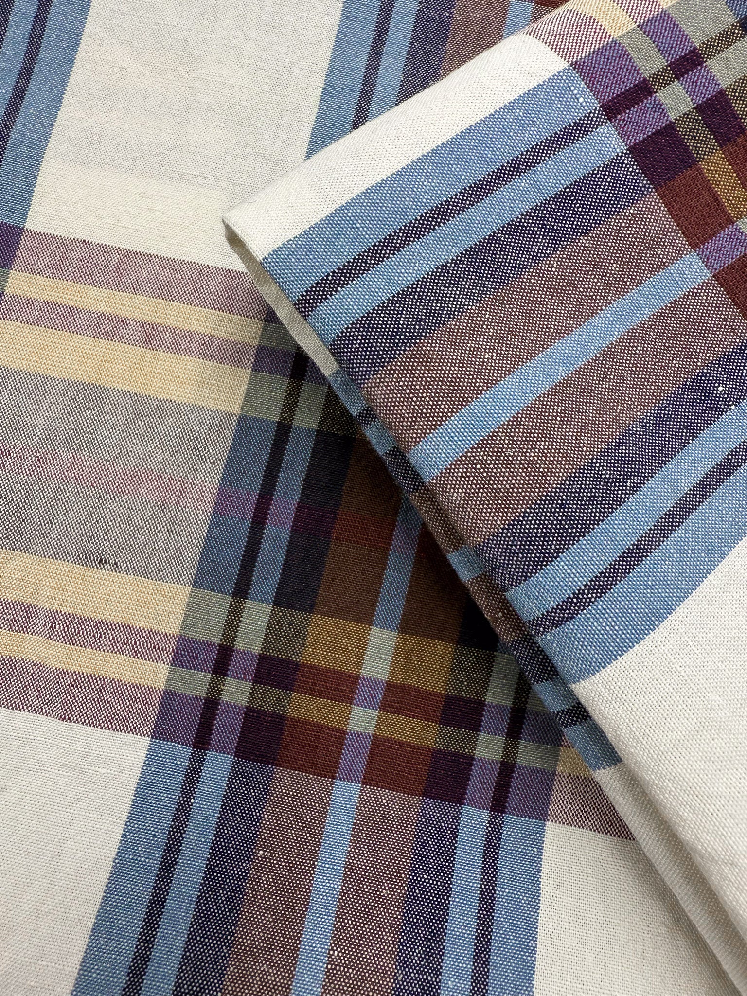 Richly layered with jewel like plum, blue & mustard plaid tones. Perfect for statement tailoring.