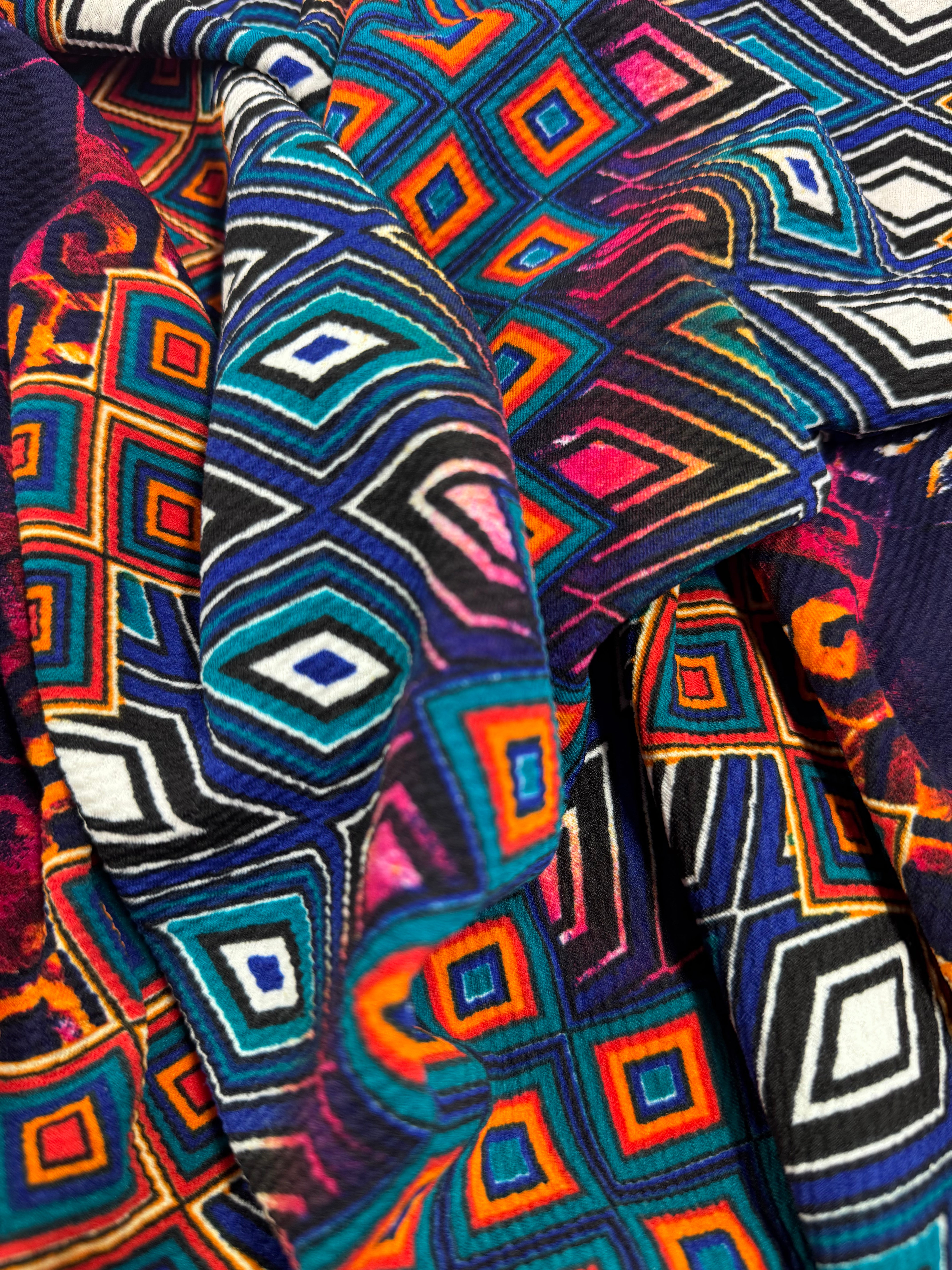 Colour: Bright multicoloured geometric tribal pattern