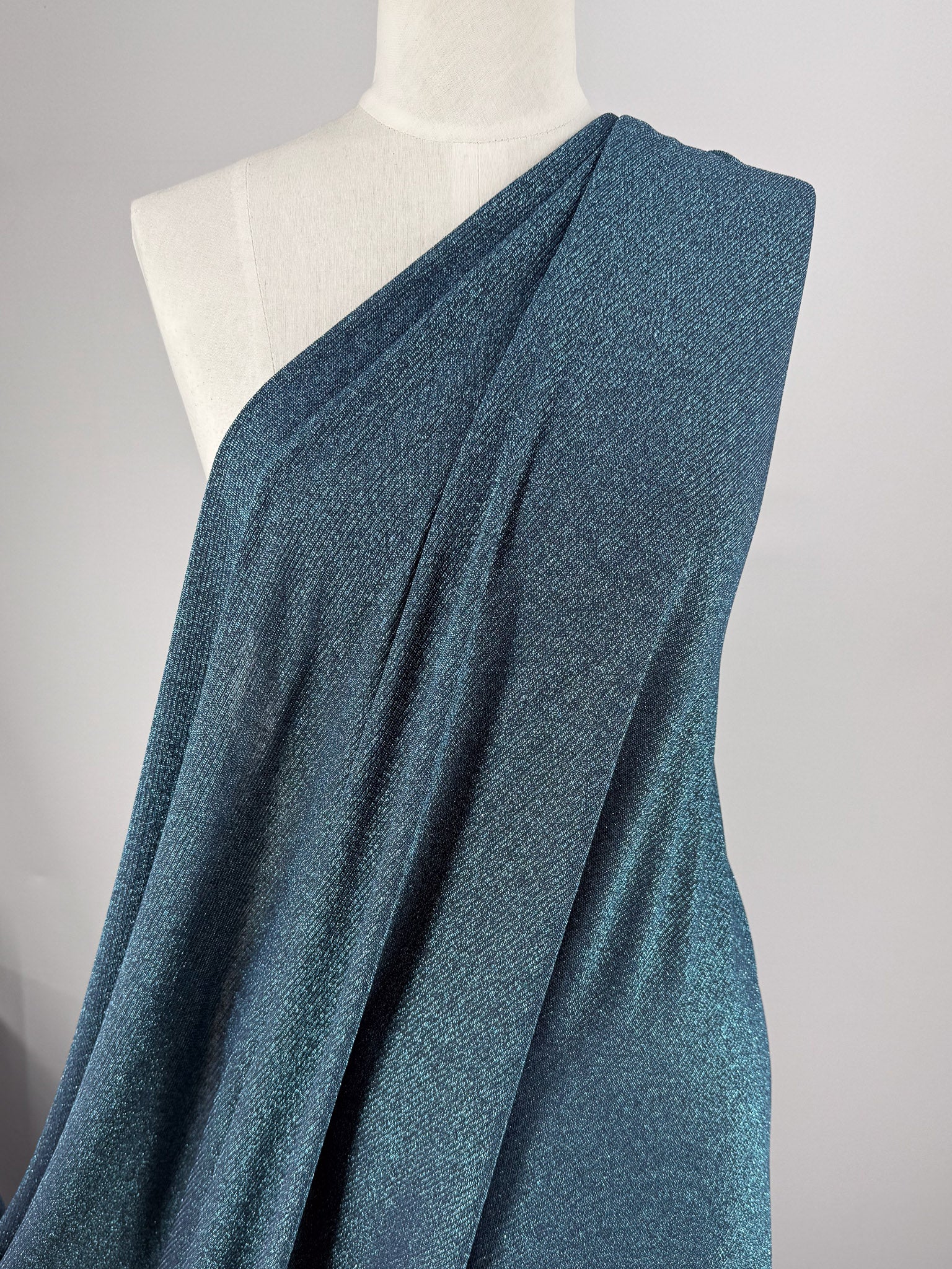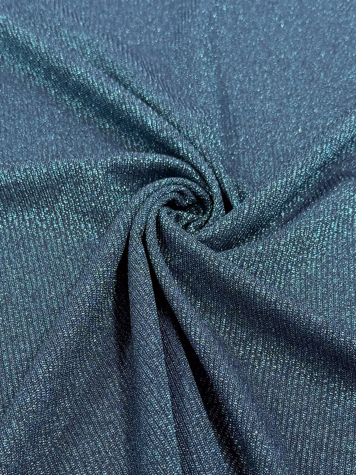 A shimmering teal viscose, lurex knit fabric with subtle metallic depth.