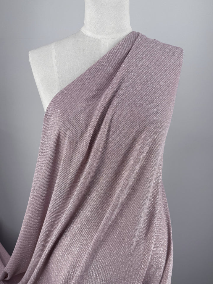 A rich viscose lurex knit with a subtle shimmer and soft, fluid drape. Lightweight and comfortable, this ribbed Knit is ideal for elegant tops, dresses, and relaxed eveningwear.